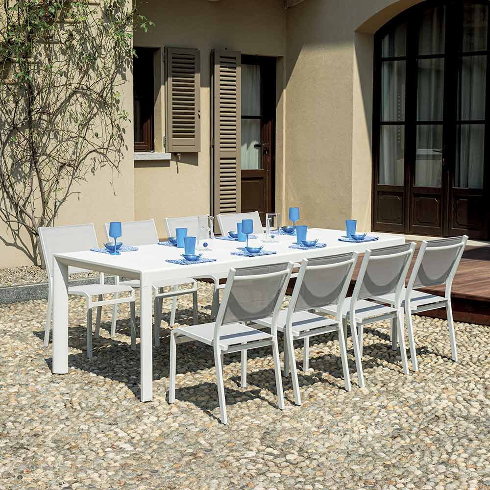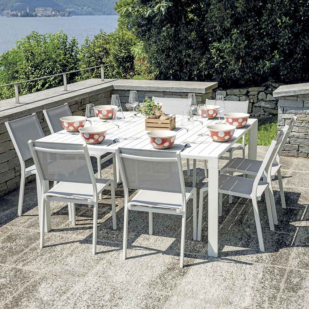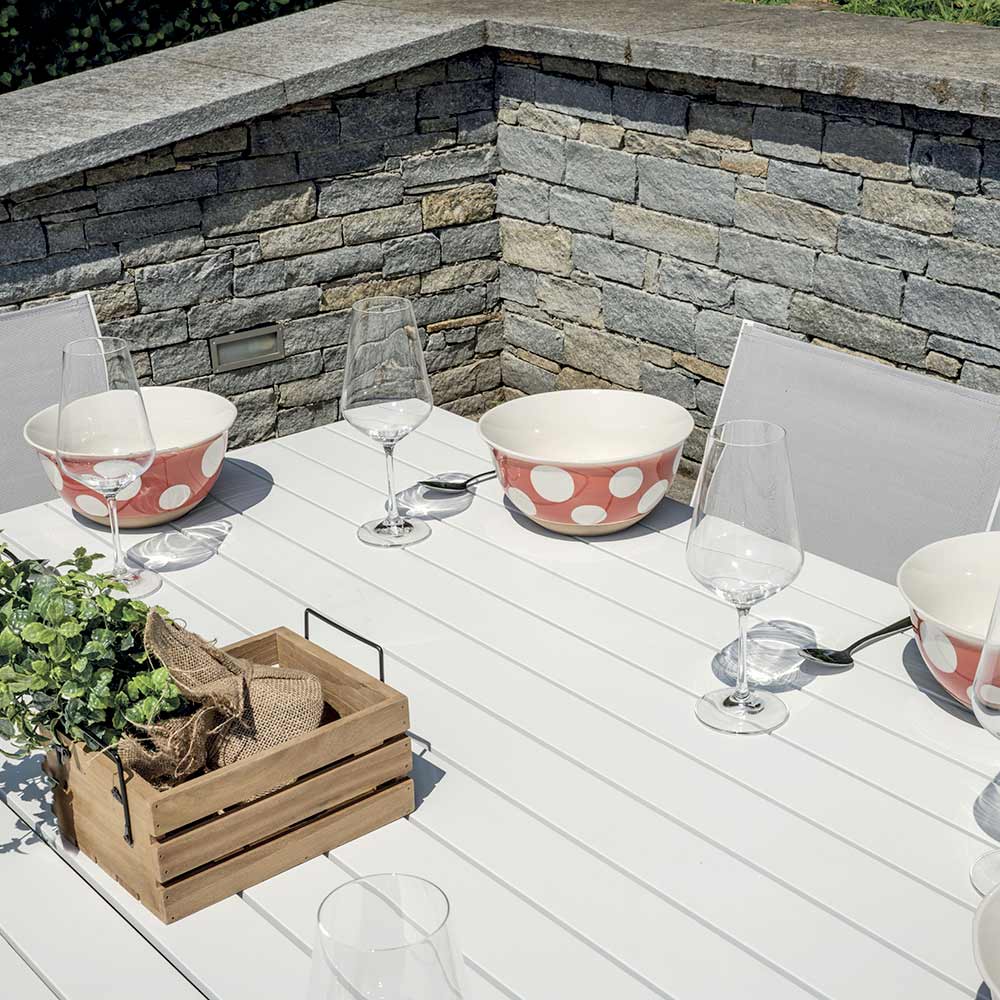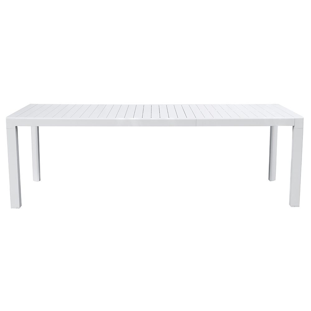 Elegância, força e praticidade se encontram nesta mesa de alumínio branco com tampo de ripas, uma peça de mobiliário que combina funcionalidade e estilo moderno. O acabamento branco e as linhas limpas tornam-no adequado para qualquer espaço ao ar livre, do jardim ao terraço, adicionando um toque de sofisticação intemporal.