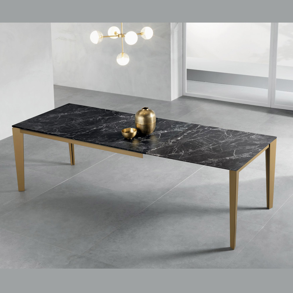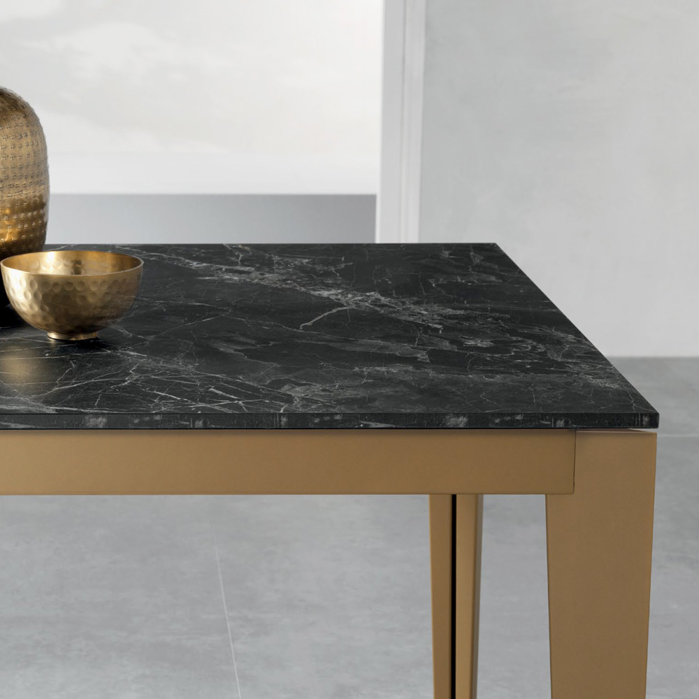 Elegante e funcional, esta mesa retangular extensível combina design moderno e praticidade. O tampo em laminado com efeito mármore escuro, de 18 mm de espessura, realça os veios autênticos e quentes do mármore, enquanto os pés de metal com pintura dourada envelhecida conferem estabilidade e um toque contemporâneo.