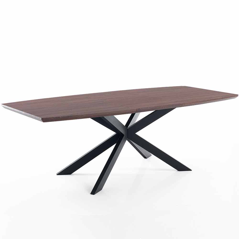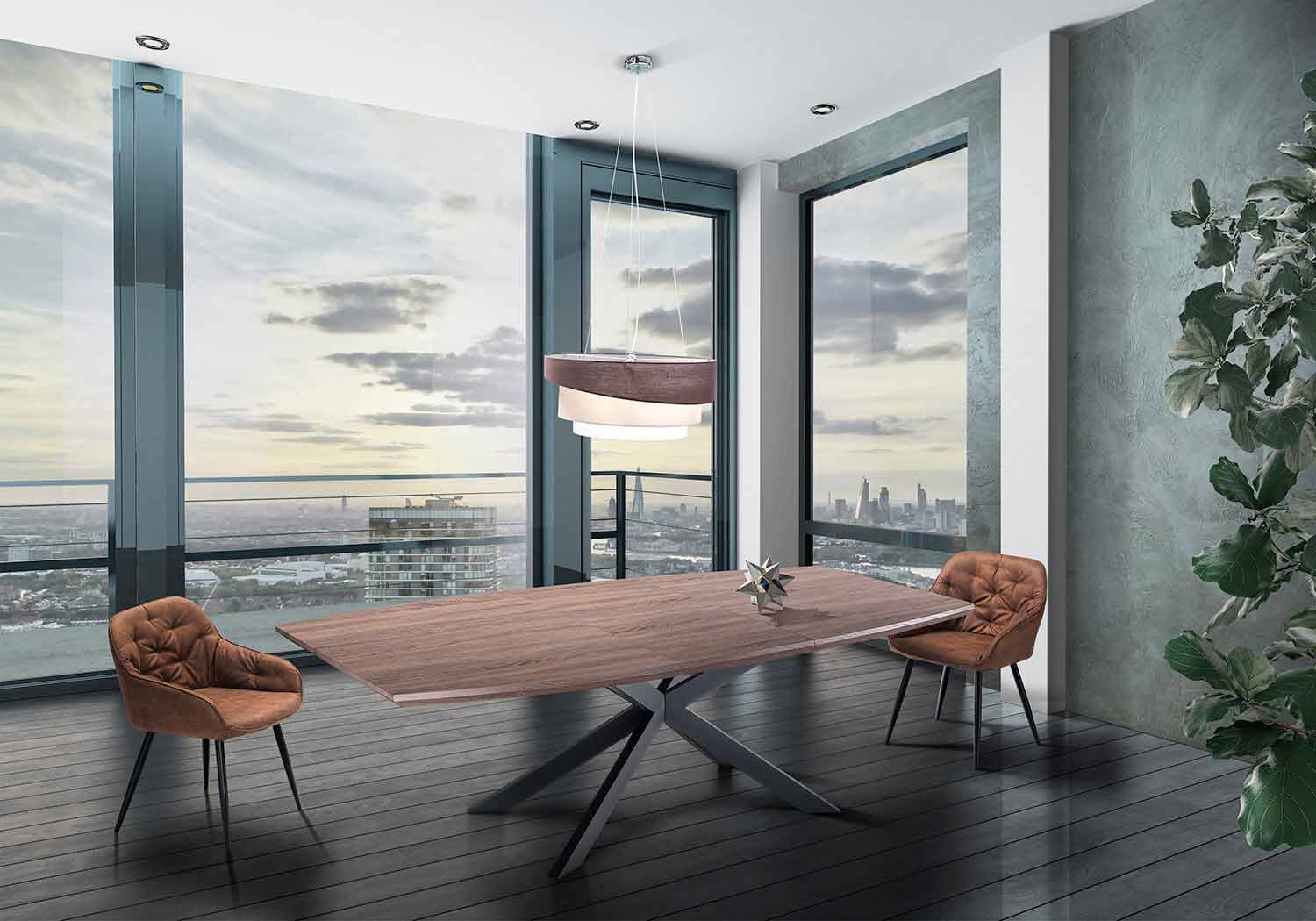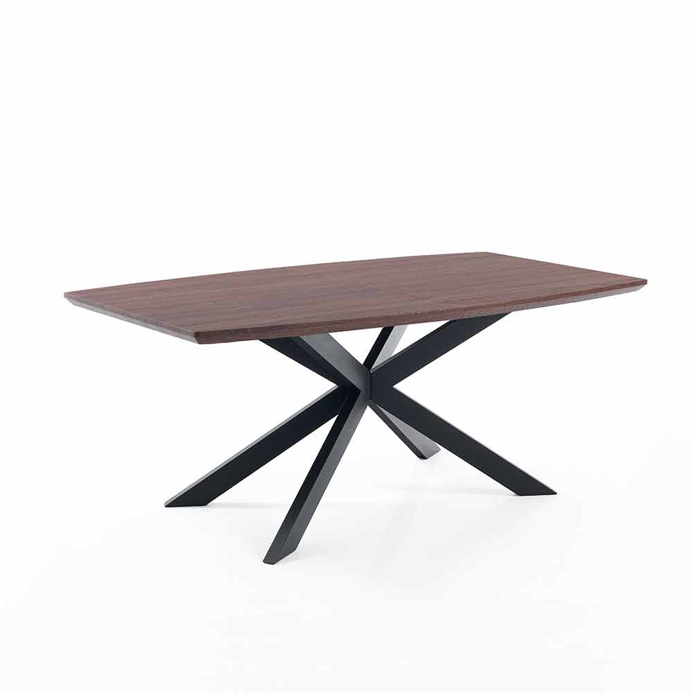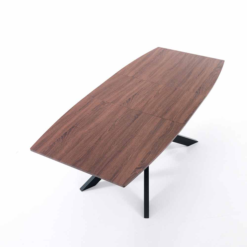 Torquato é uma mesa de jantar extensível brilhante realizada com um tampo de Mdf (espessura de 4cm) coberta com acabamento de nogueira escura de papel 3D e pernas de metal pintadas de preto mate.