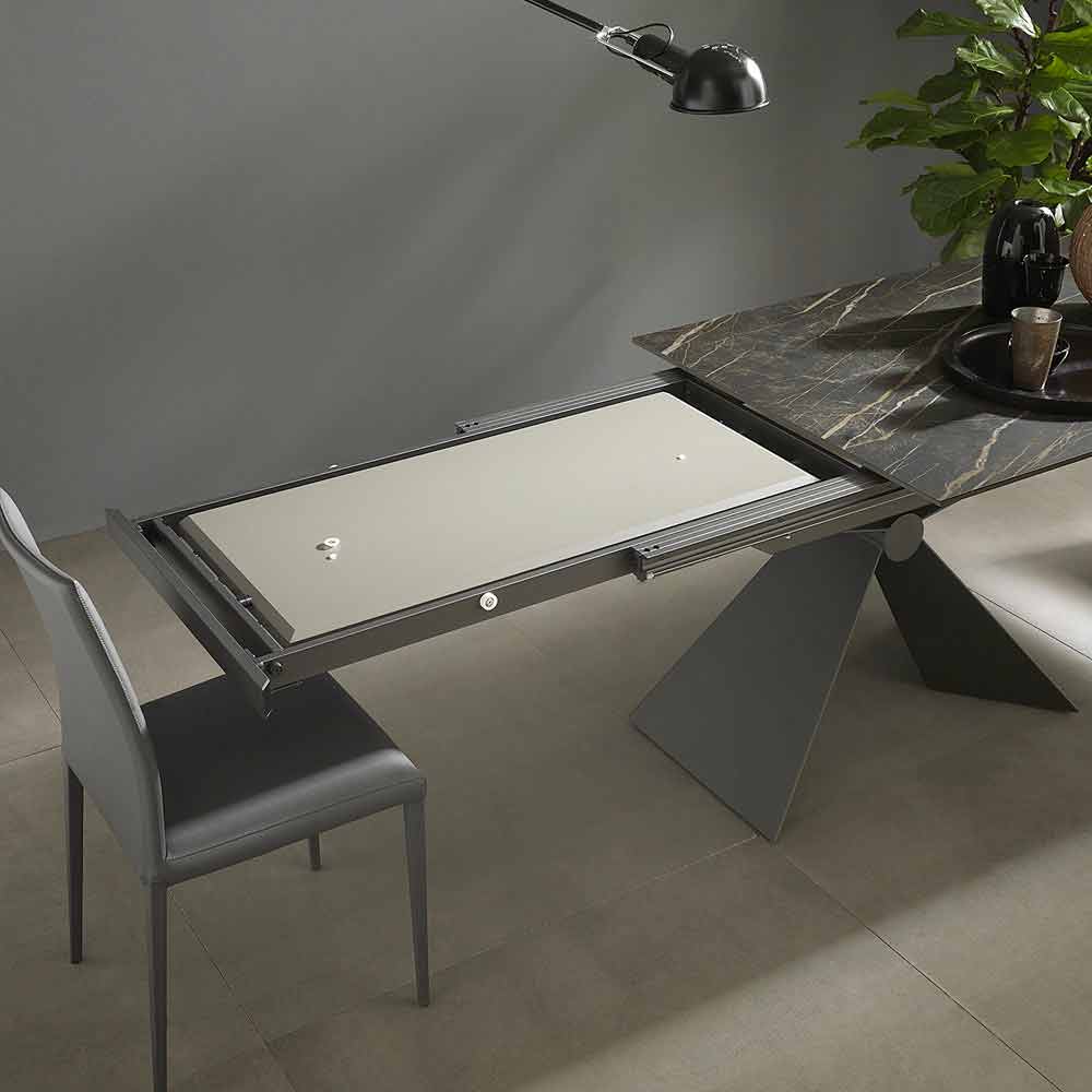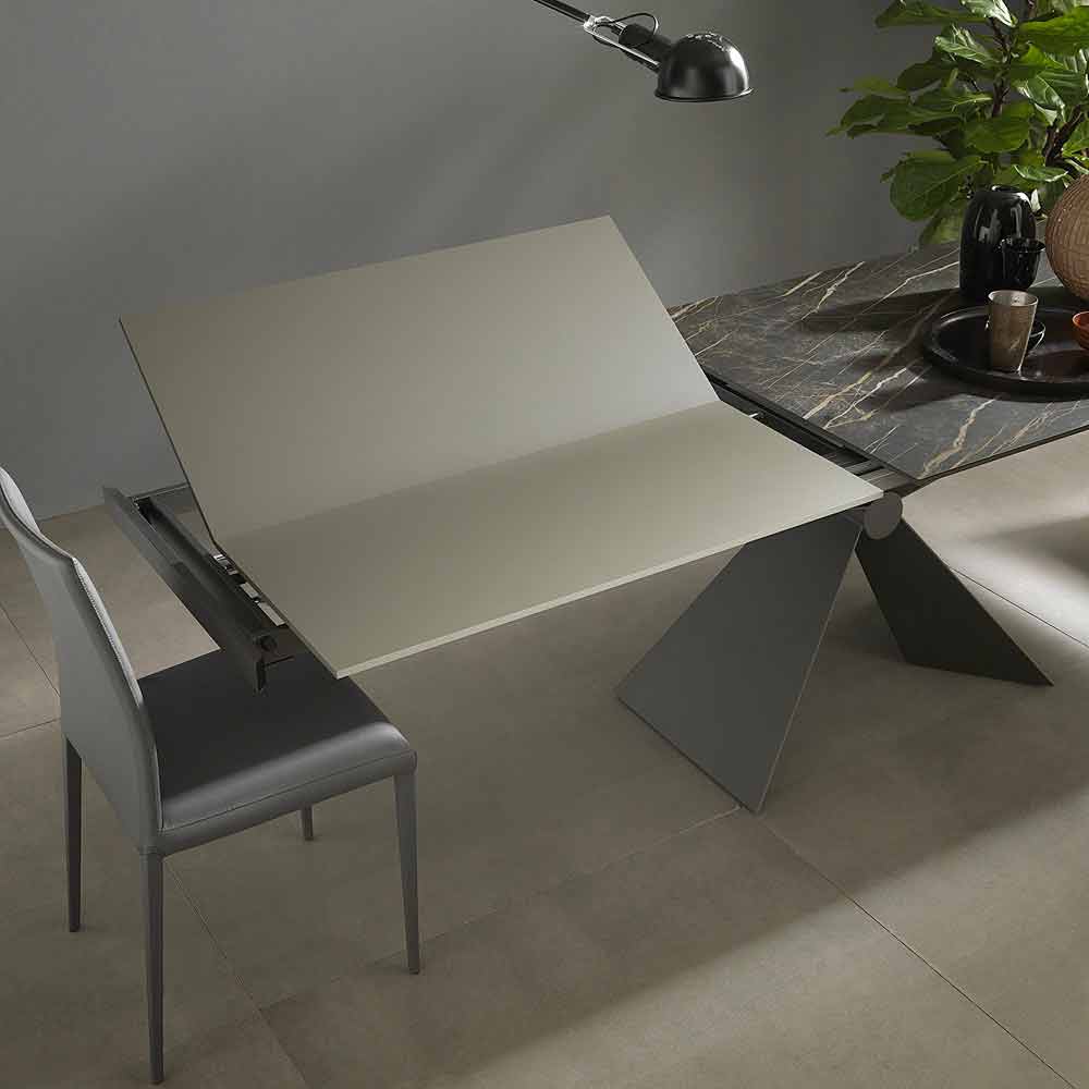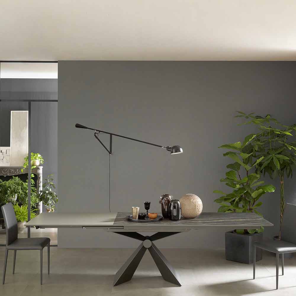 Base de mesa de jantar extensível com nó de metal e tampo de cerâmica fabricado na Itália.