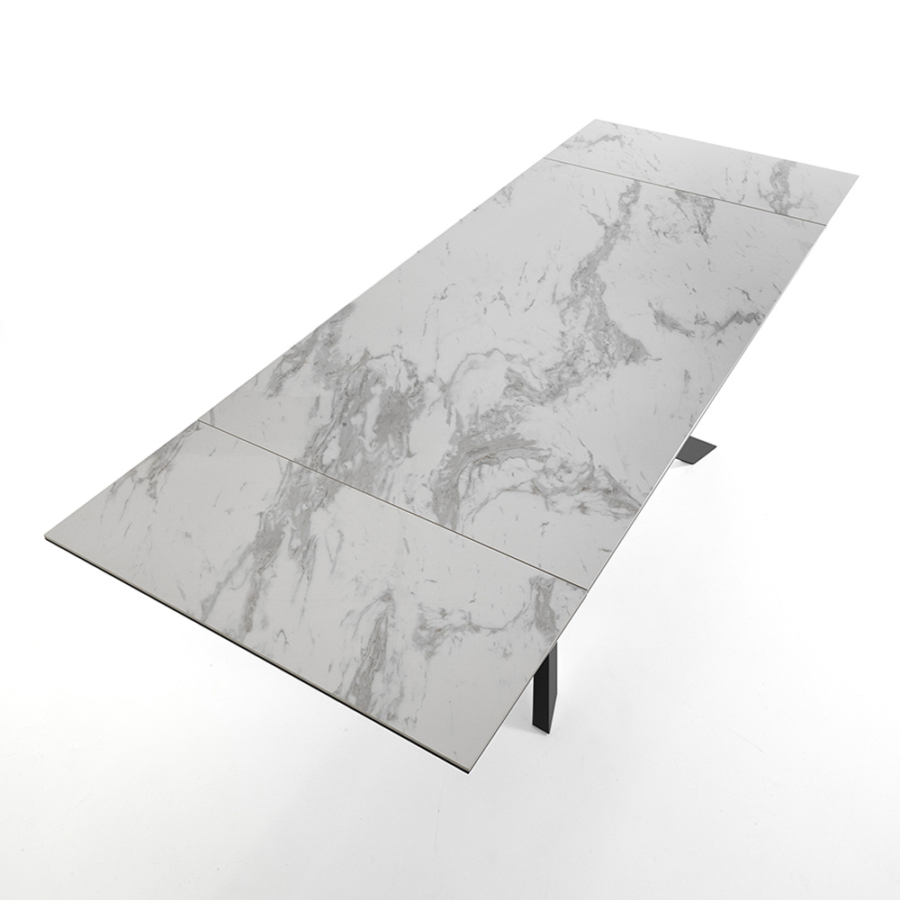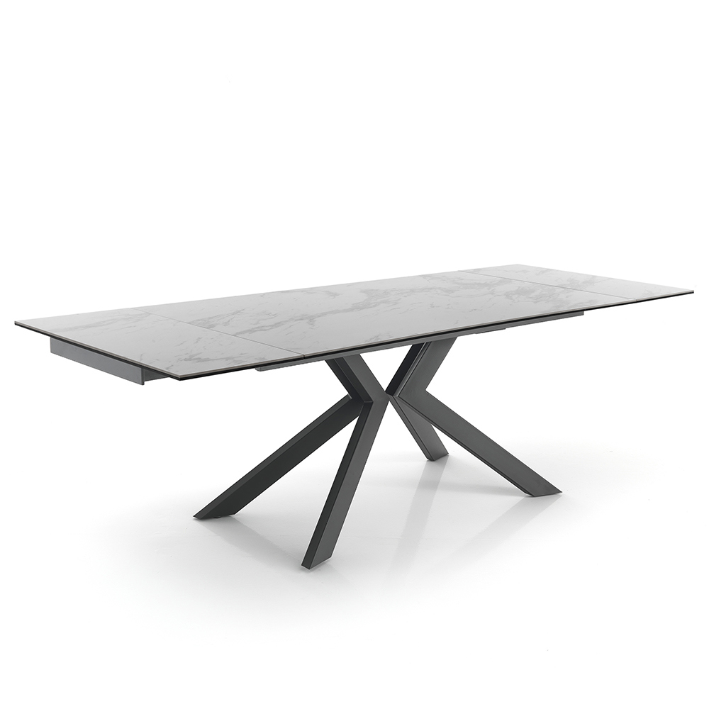 Mesa de jantar com base em metal pintado de cinza fosco e tampo extensível até 240 cm em cerâmica com acabamento em mármore branco fosco . Extensões de 40 cm posicionadas sob o tampo da mesa. Graças à possibilidade de ser alargado, pode acolher um maior número de amigos e familiares para passar agradáveis noites em companhia.
