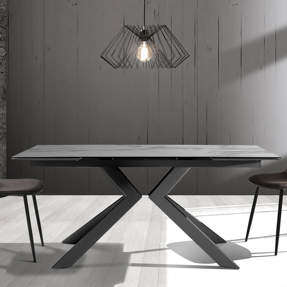 Mesa de jantar extensível até 240 cm em cerâmica e metal pintado de cinza.