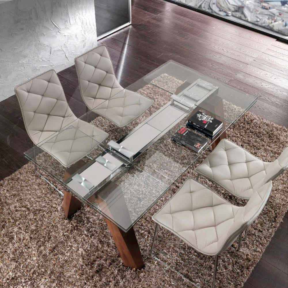 A moderna mesa extensível Chade tem um tampo de vidro temperado transparente e pés de madeira maciça.