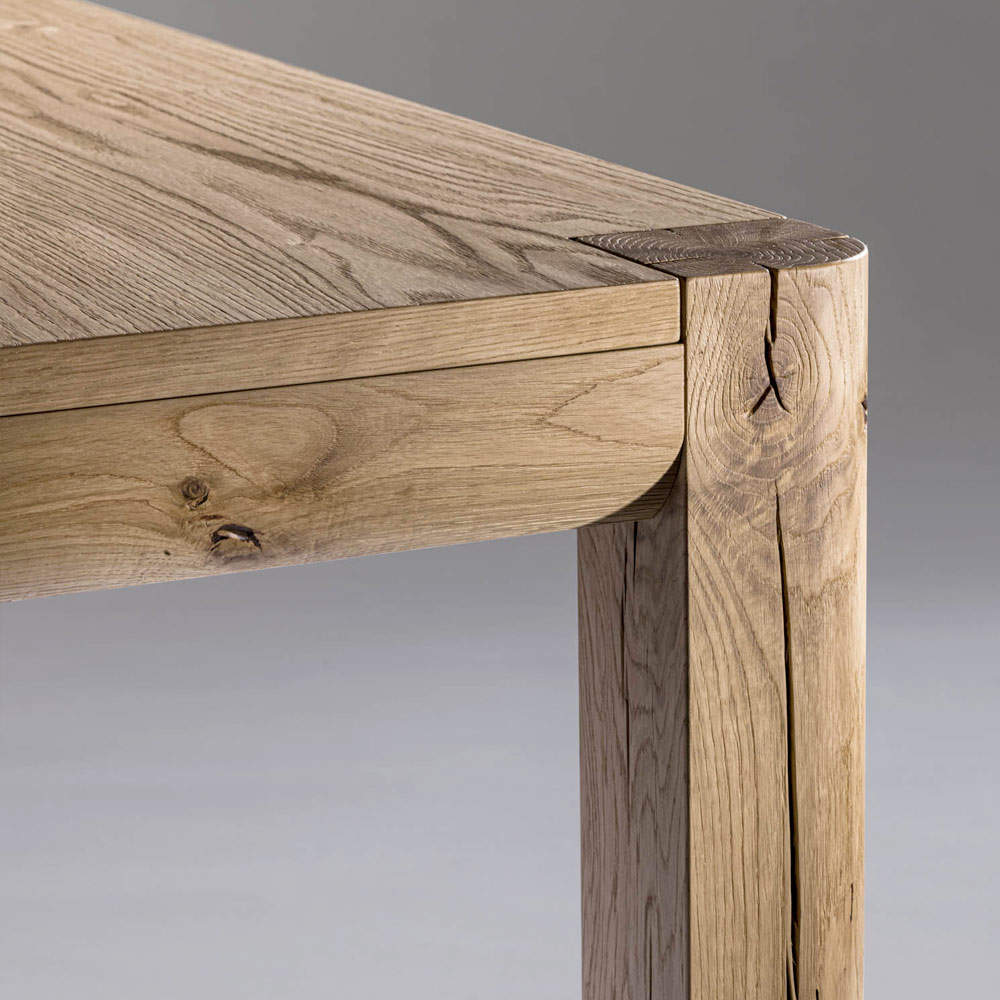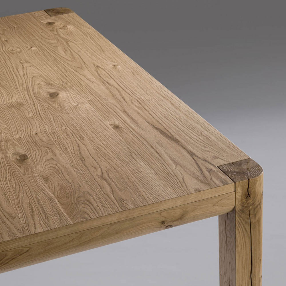 Mesa extensível com tampo em madeira folheada a carvalho natural e pés quadrados maciços com fissuras e nós 12x12cm. Dimensões H 77 cm, espessura 3 cm.