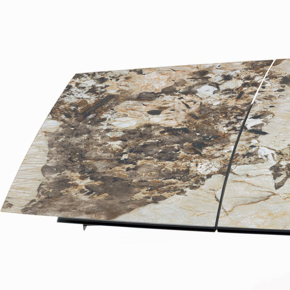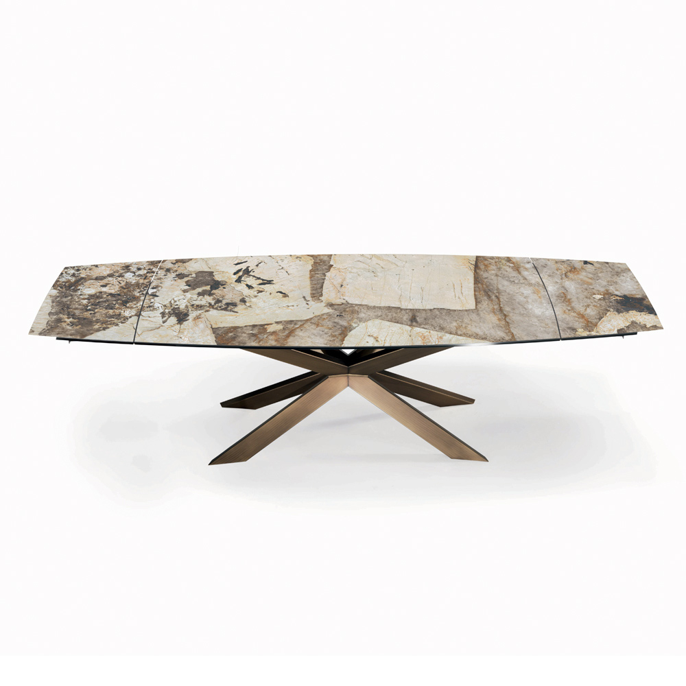 Mesa de sala extensível em forma de barril com extensões integradas, tampo em cerâmica com acabamento Deset Soul polido , canto