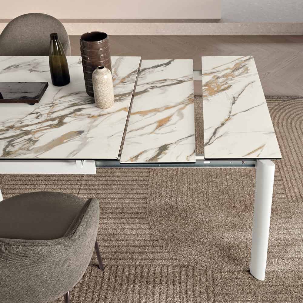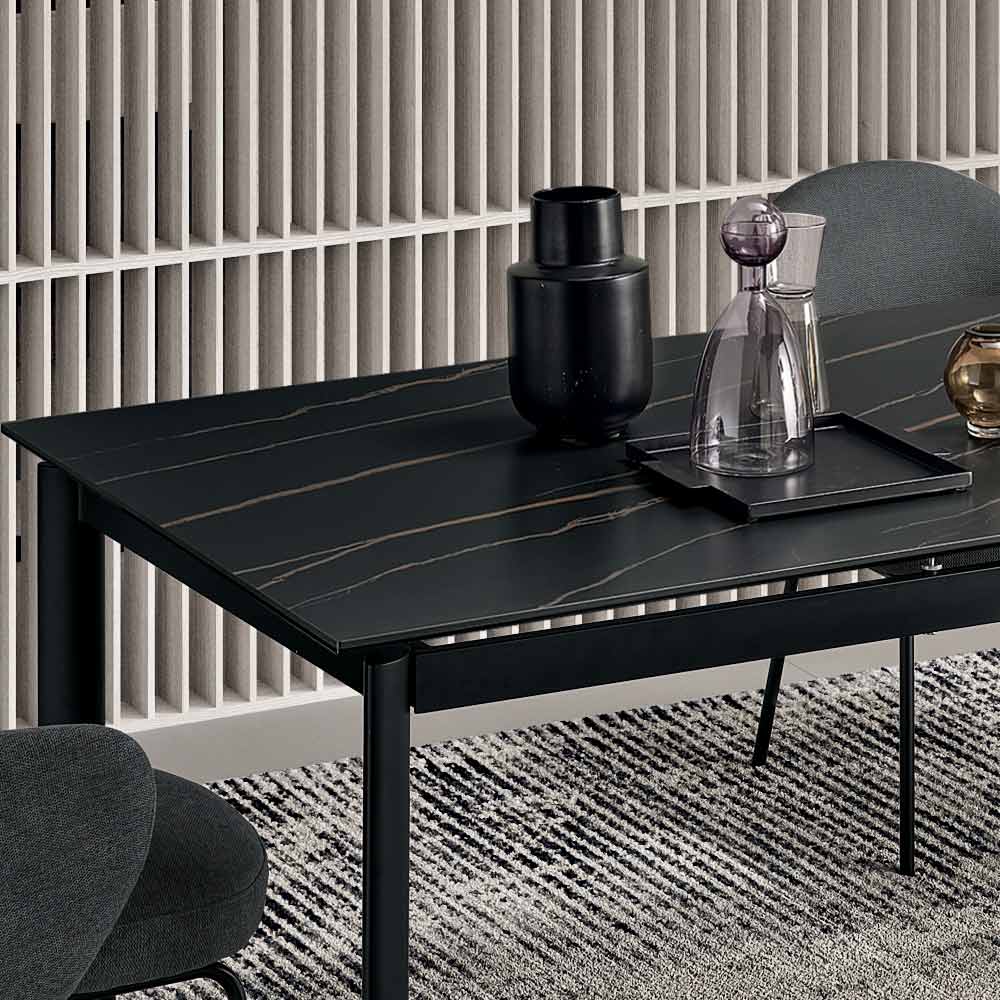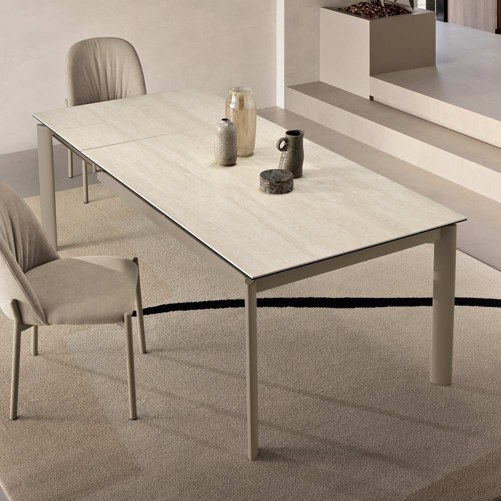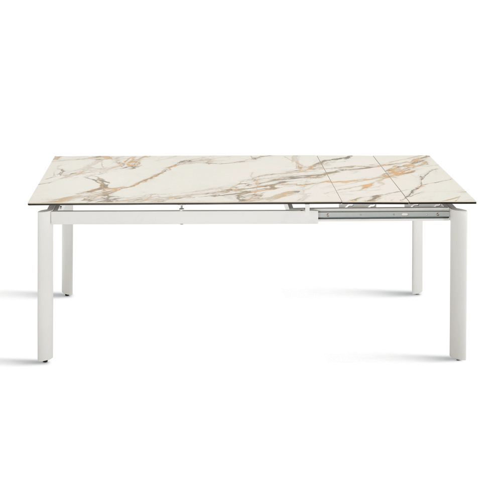 Uma elegante mesa extensível com design minimalista, ideal para adicionar um toque de estilo à sua sala de jantar ou sala de estar . A estrutura de metal pintado suporta um refinado tampo de porcelanato com efeito mármore , projetado para uso prático e versátil no dia a dia.
