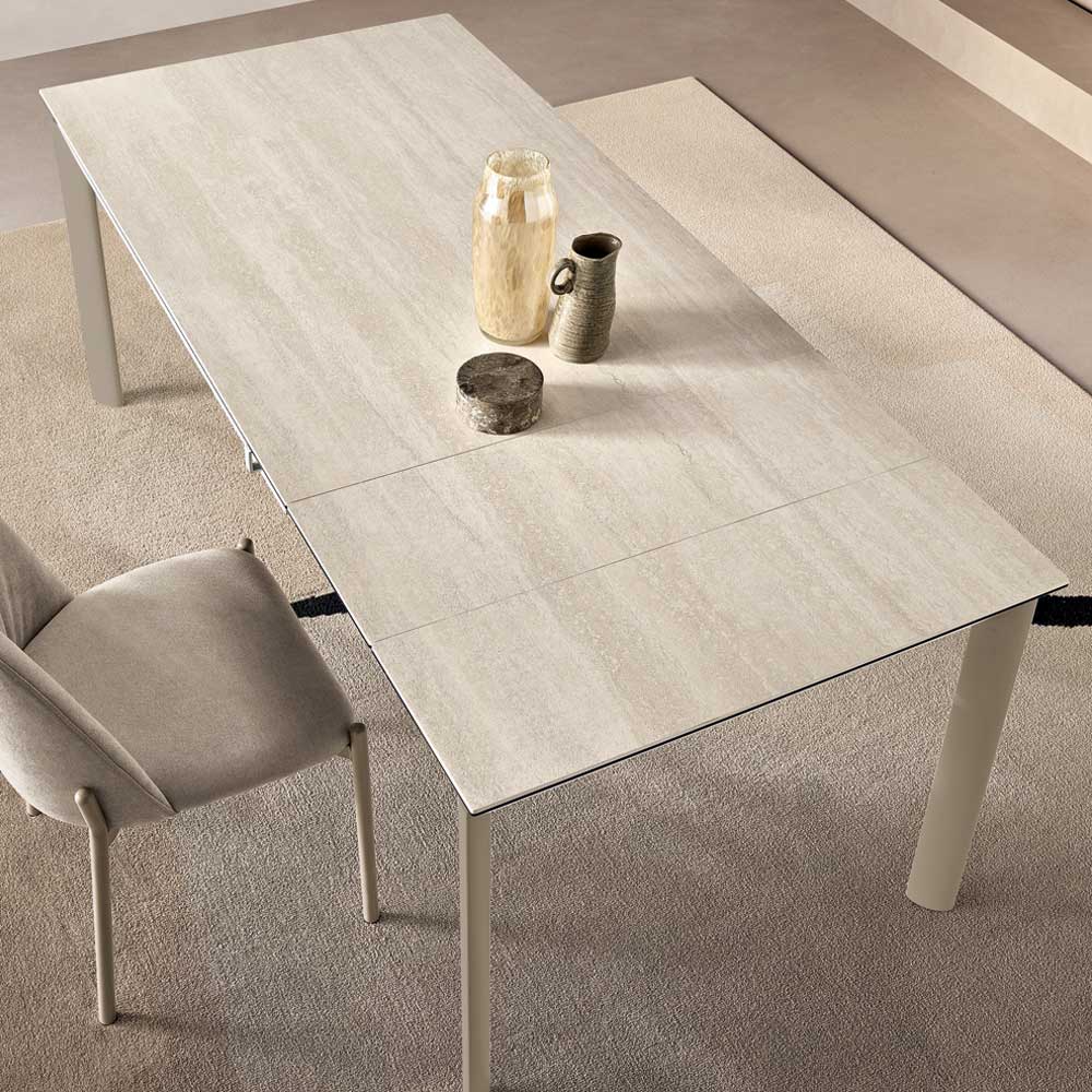 Os pés posicionados nos cantos liberam espaço sob o tampo, melhorando o conforto ao sentar e realçando a estética clean da mesa. O tampo parece ligeiramente elevado para acomodar discretamente as extensões, mantendo uma aparência organizada mesmo quando fechado.