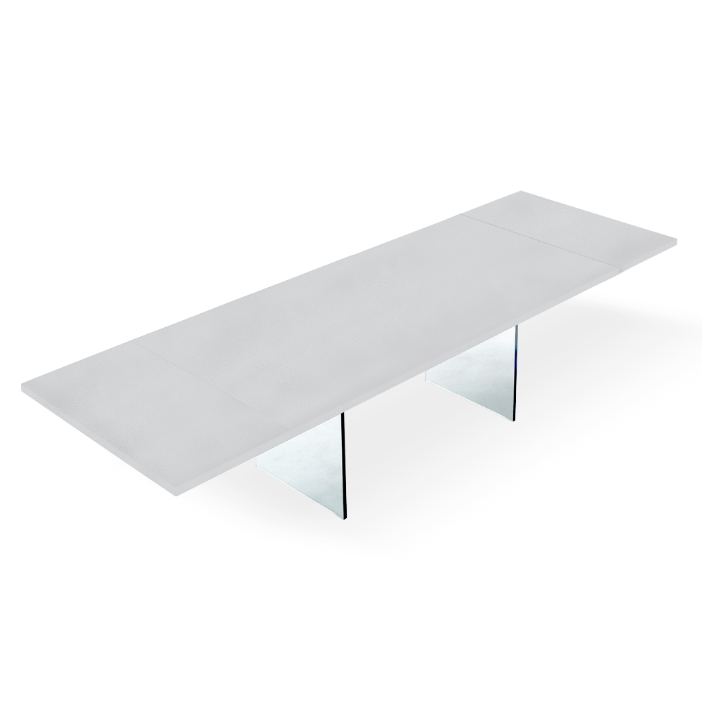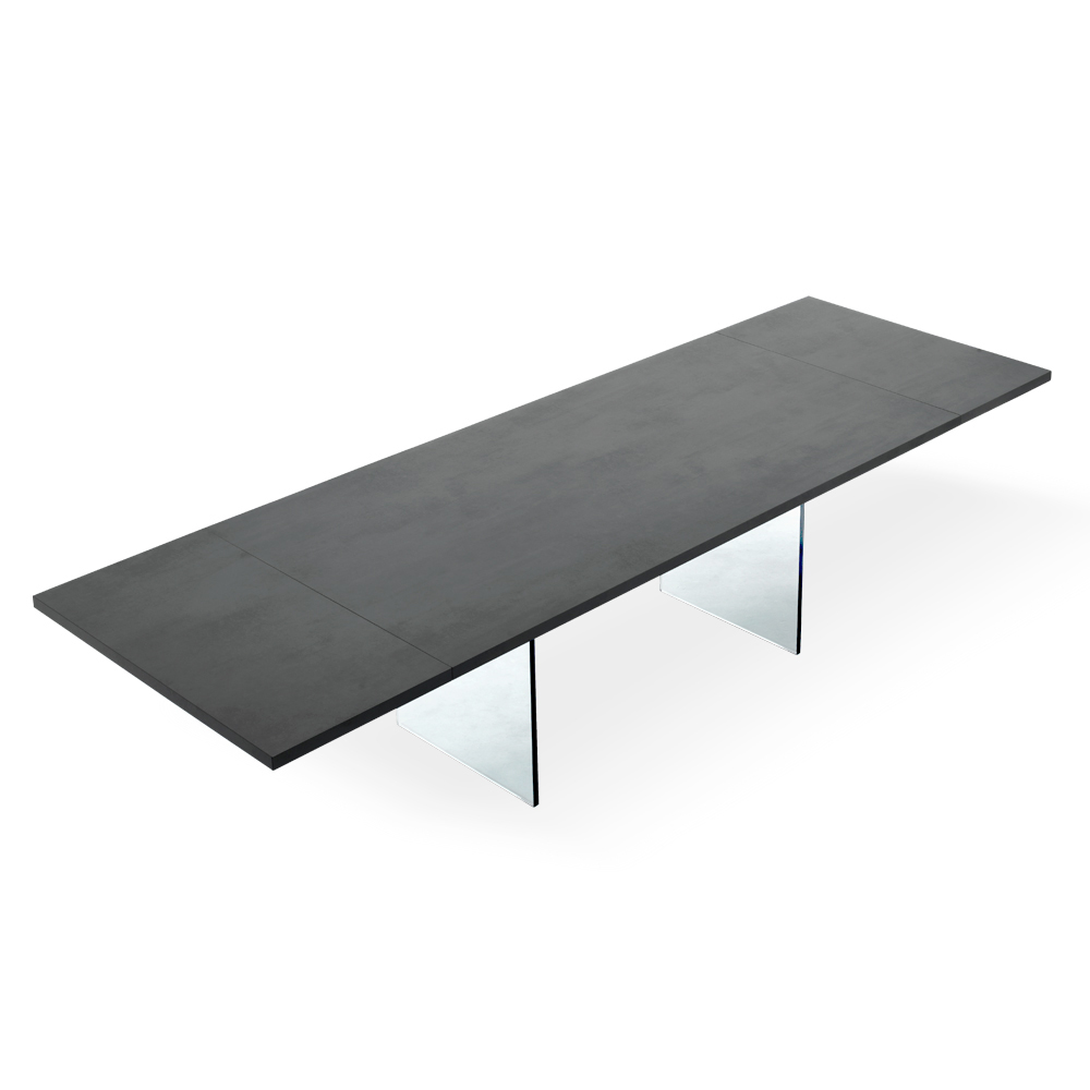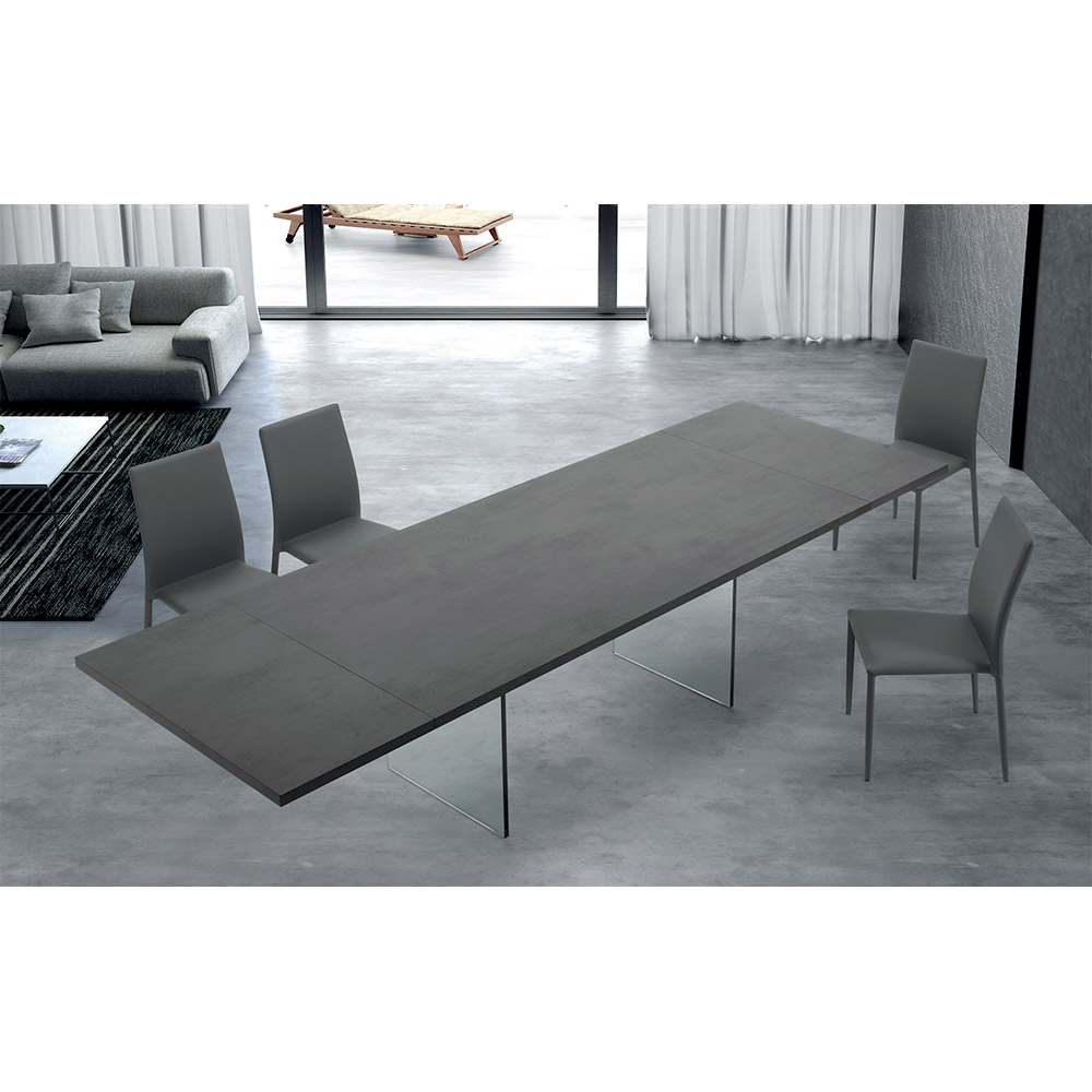 Mesa extensível com tampo em madeira laminada e base em vidro transparente feita à mão na Itália.