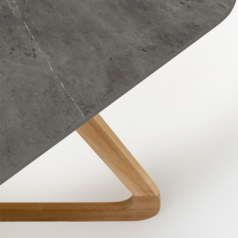 fabricada em Itália. Esta mesa para área externa com tampo de cerâmica Pietra Grey é uma excelente opção para quem busca um design simples, porém impactante. Ela combina uma base de madeira resistente com um tampo de cerâmica que imita perfeitamente a elegância da pedra cinza, com veios brancos sutis que adicionam profundidade e personalidade ao design geral.