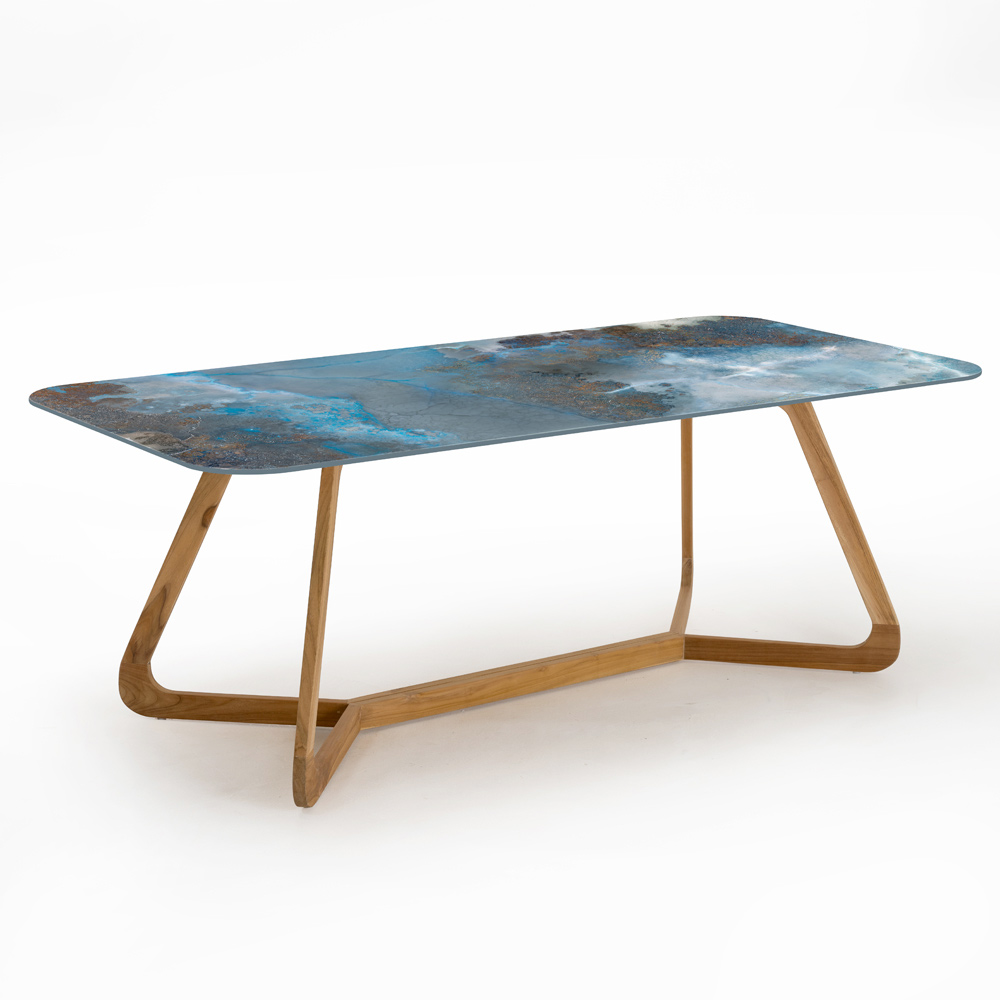 fabricada na Itália. Esta mesa para área externa é a fusão perfeita de elegância natural e arte moderna. O tampo, feito em cerâmica de alta qualidade, apresenta um acabamento exclusivo que imita as texturas orgânicas e as cores vibrantes de uma formação rochosa, com tons de azul, cinza e detalhes em cobre. Esta superfície não é apenas atraente, mas também extremamente durável, ideal para o uso diário ao ar livre.