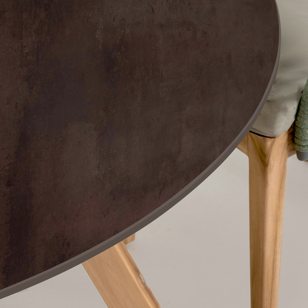 fabricada em Itália. Esta mesa para área externa é uma peça de design inspirada na estética industrial e no charme rústico da cerâmica metalizada Corten. Ela combina uma base de madeira com um tampo de cerâmica que imita a cor e a textura do metal Corten, conhecido por sua aparência enferrujada e que combina perfeitamente com ambientes externos naturais e modernos.