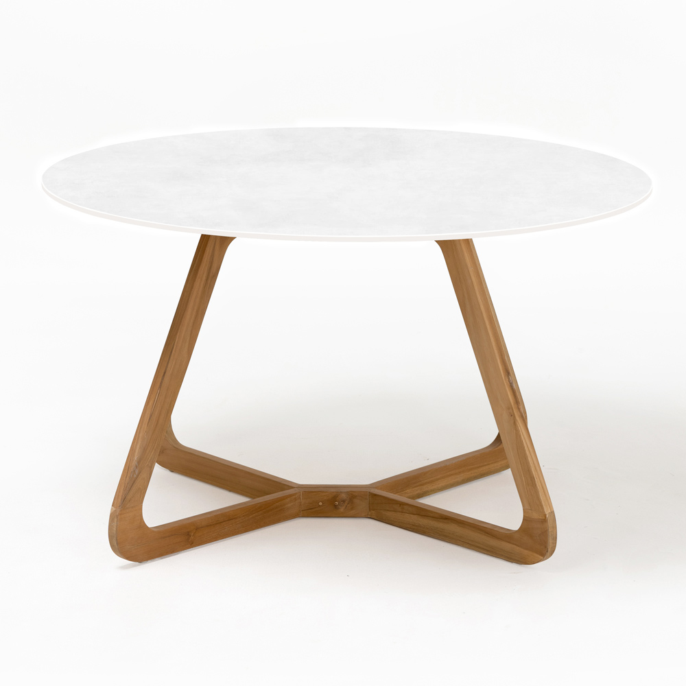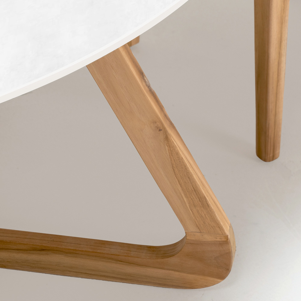 A base de madeira adiciona um contraste de calor e textura, equilibrando o frescor do tampo de cerâmica com sua riqueza e resistência. Essa combinação de materiais não é apenas esteticamente atraente , mas também oferece durabilidade e resistência excepcionais, tornando a mesa ideal para uso diário ao ar livre.