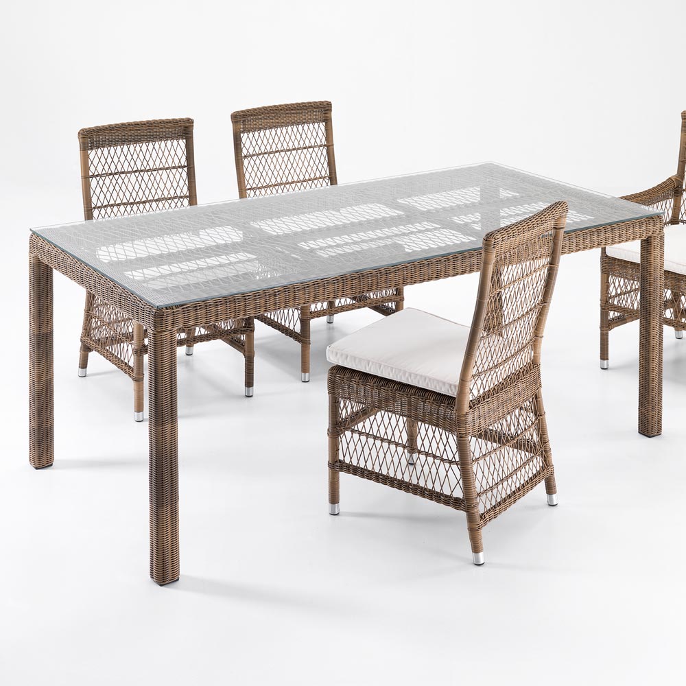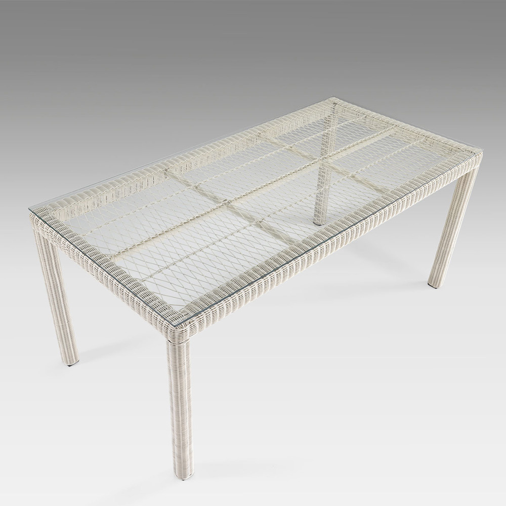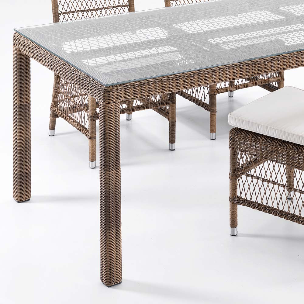A mesa de jantar retangular ao ar livre Gigi tem uma estrutura com um quadro feito de alumínio revestido a pó , no qual a fibra de alta qualidade da marca Rehau Polyrattan com uma espessura de 3 mm é tecida à mão . Além disso, a mesa é equipada com um tampo de vidro de 8 mm de espessura , que permite que a roseta tecida à mão brilhe.