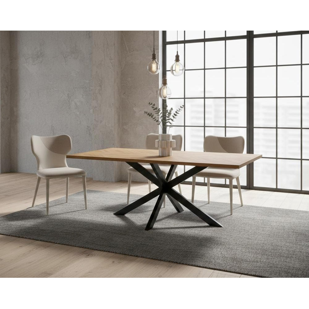 A estrutura robusta de ferro garante estabilidade e durabilidade, enquanto o design diferenciado das pernas cruzadas adiciona um toque moderno e marcante, perfeito para ambientes contemporâneos, industriais ou minimalistas.