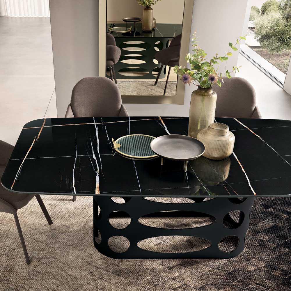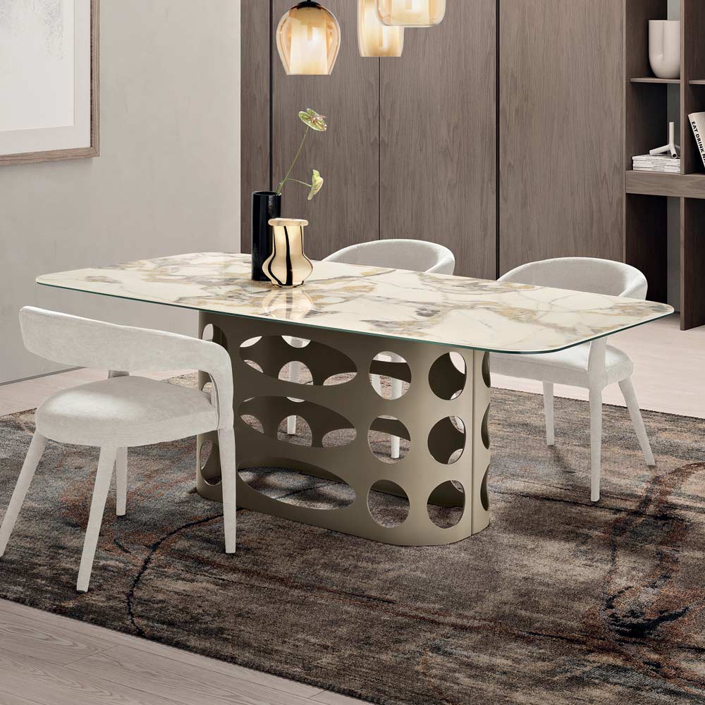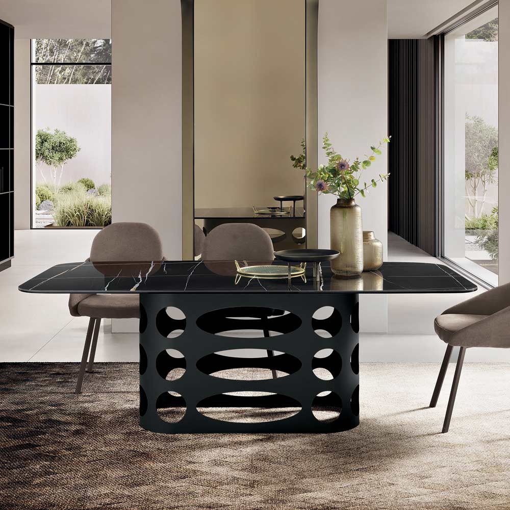 Graças à combinação da materialidade da cerâmica com o design perfurado da base, esta mesa representa uma solução refinada e contemporânea capaz de valorizar qualquer ambiente da casa, tornando-se a verdadeira protagonista da sala de jantar.
