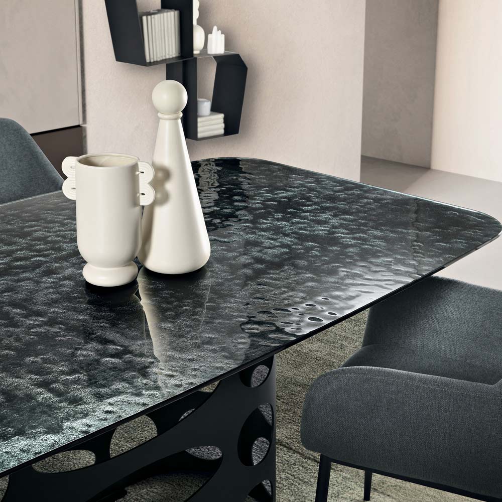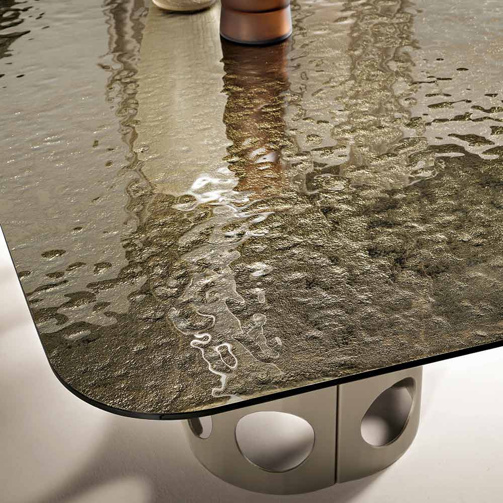 O tampo de vidro martelado confere profundidade e personalidade à mesa graças ao seu acabamento texturizado exclusivo, que reflete a luz em um padrão irregular, criando efeitos visuais impressionantes. Esse processo torna cada superfície dinâmica e refinada, realçando o design contemporâneo do produto.