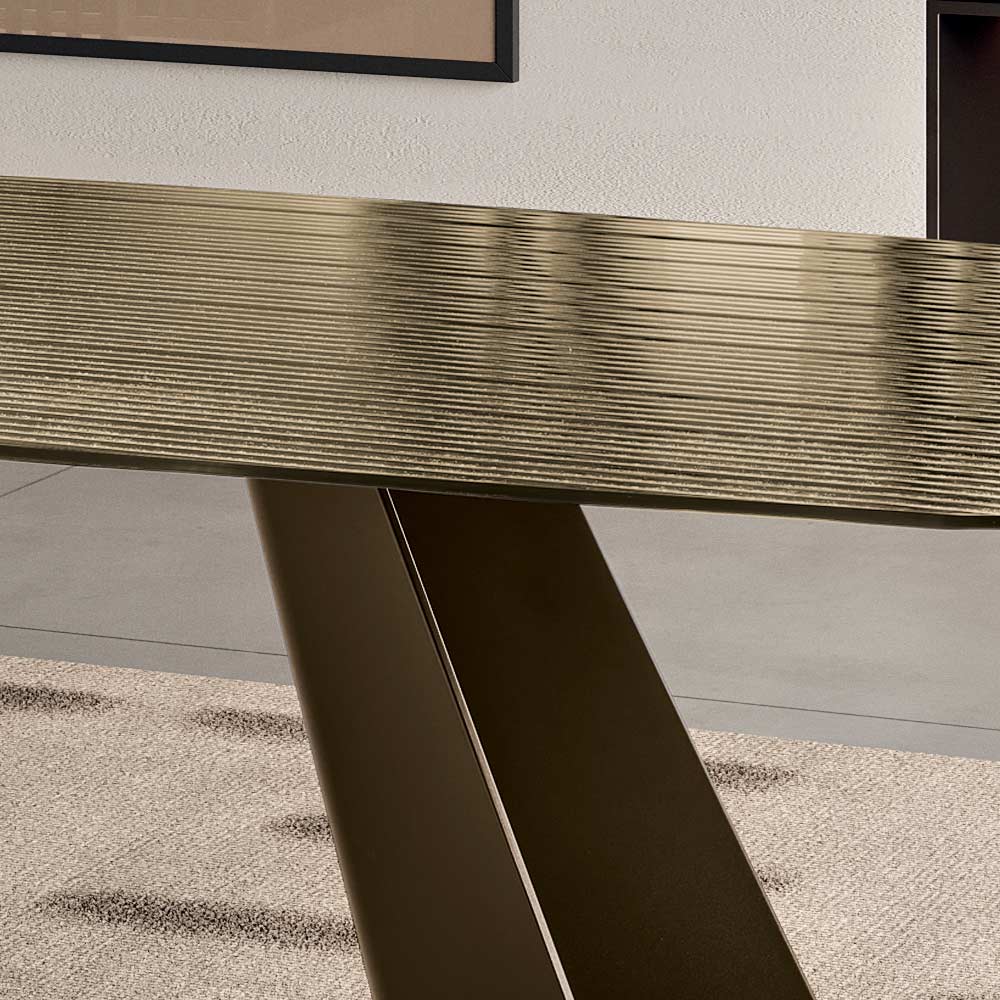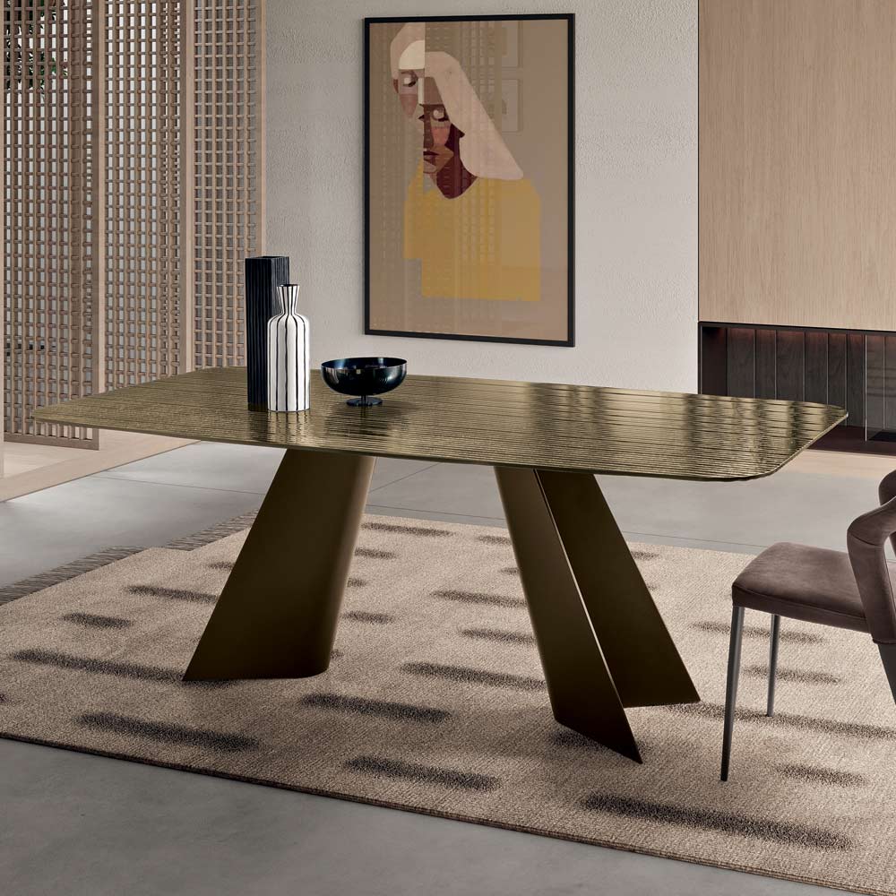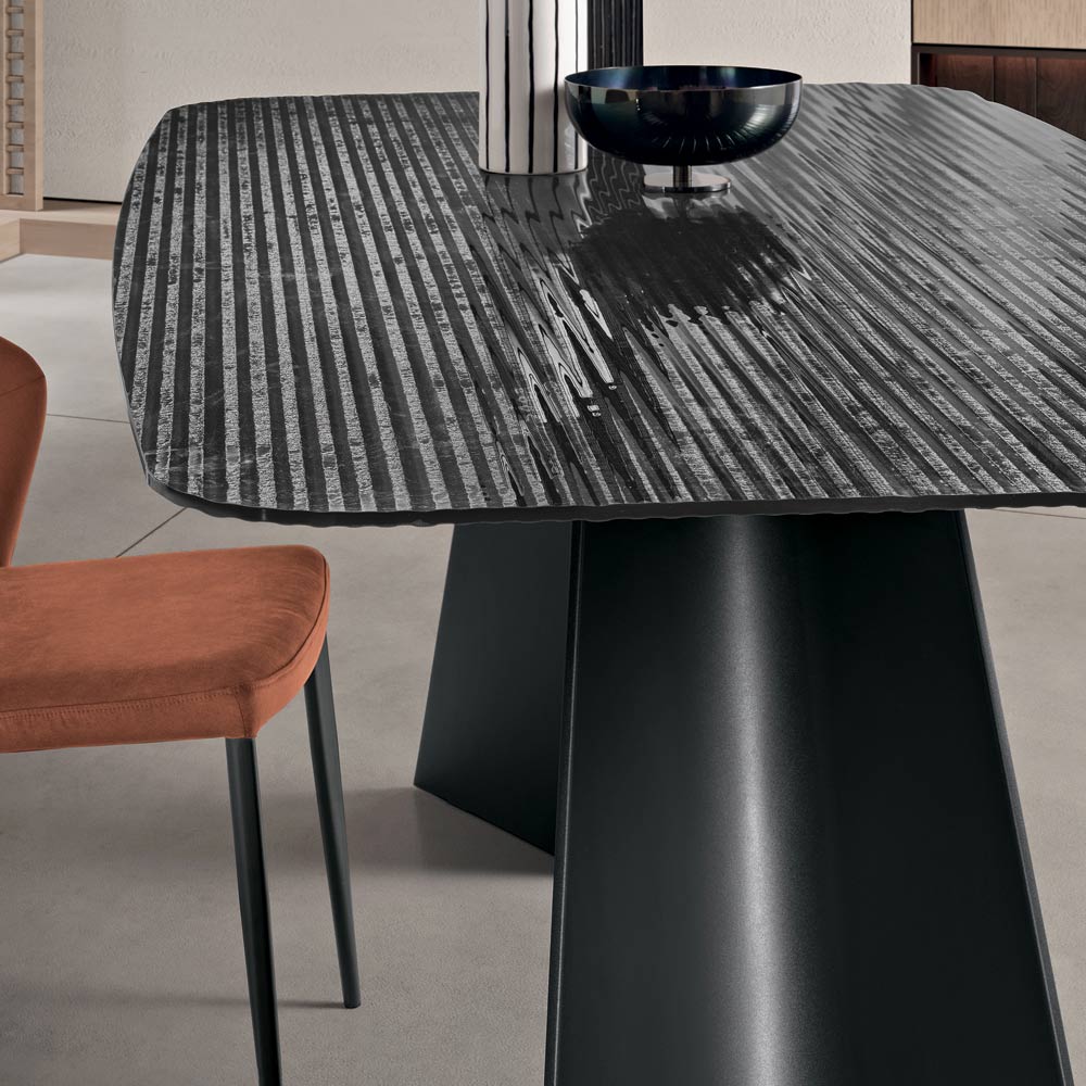 Uma mesa de jantar de design refinado, fabricada na Itália , concebida para embelezar com elegância a sala de jantar ou a sala de estar . A mesa destaca-se pelo seu tampo de vidro canelado com revestimento prateado na parte de trás , um material luminoso que reflete a luz, criando efeitos visuais evocativos e conferindo ao ambiente um toque de sofisticação.