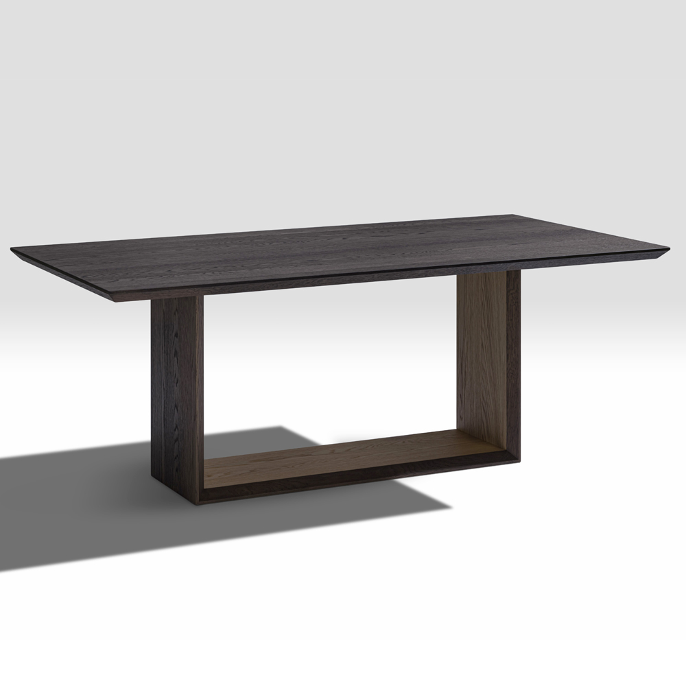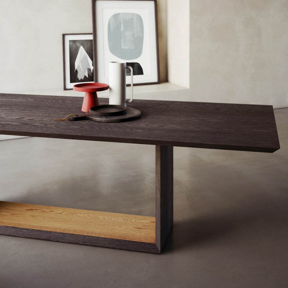 Mesa fixa com tampo biselado folheado a aglomerado de choupo carvalho cor fumê . Base chanfrada em folheado bicolor, exterior em carvalho fumado e interior em carvalho natural.