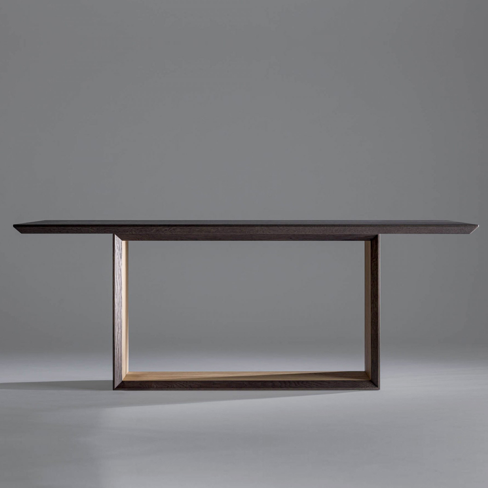 Mesa fixa com tampo chanfrado em carvalho fumê e base bicolor Fabricado na Itália.