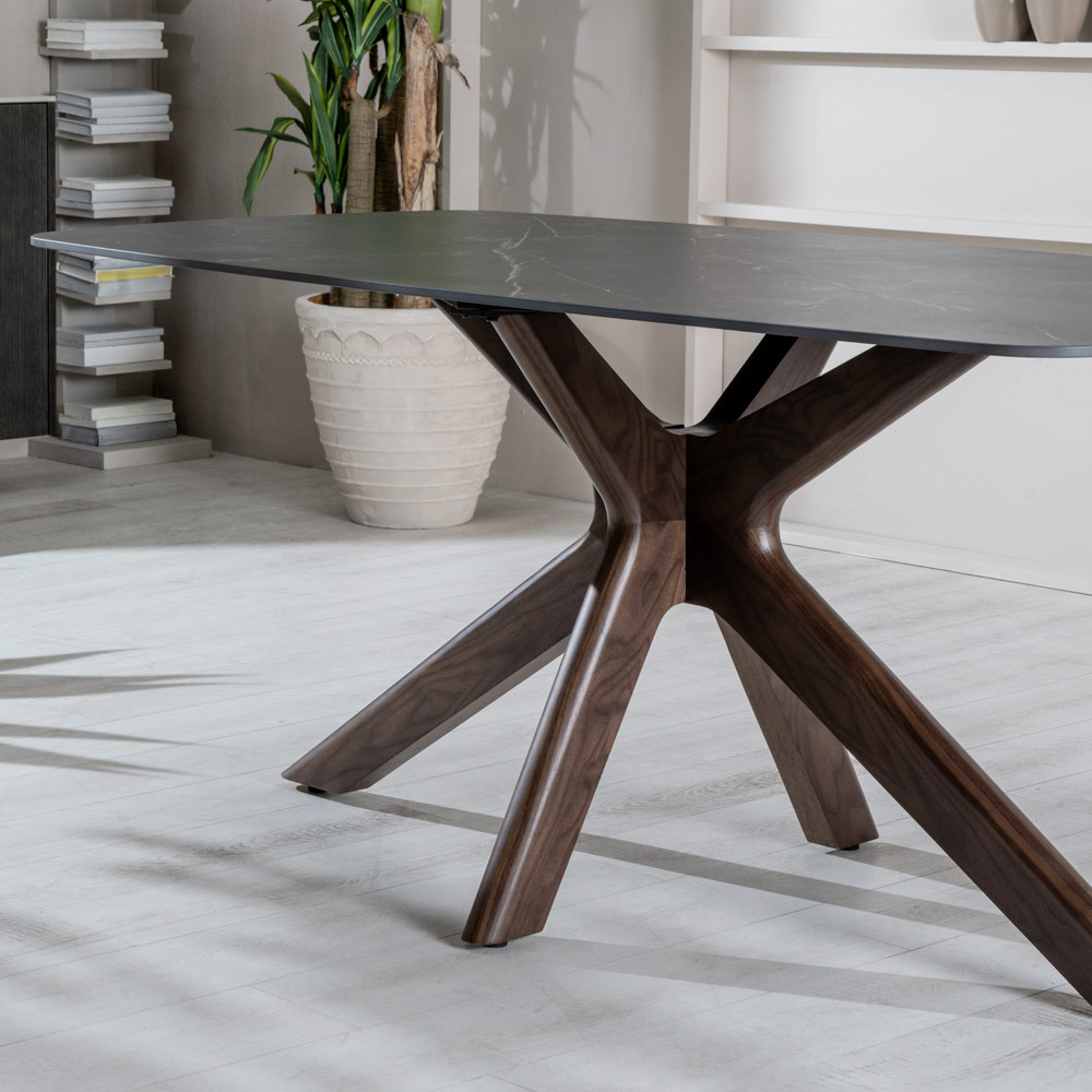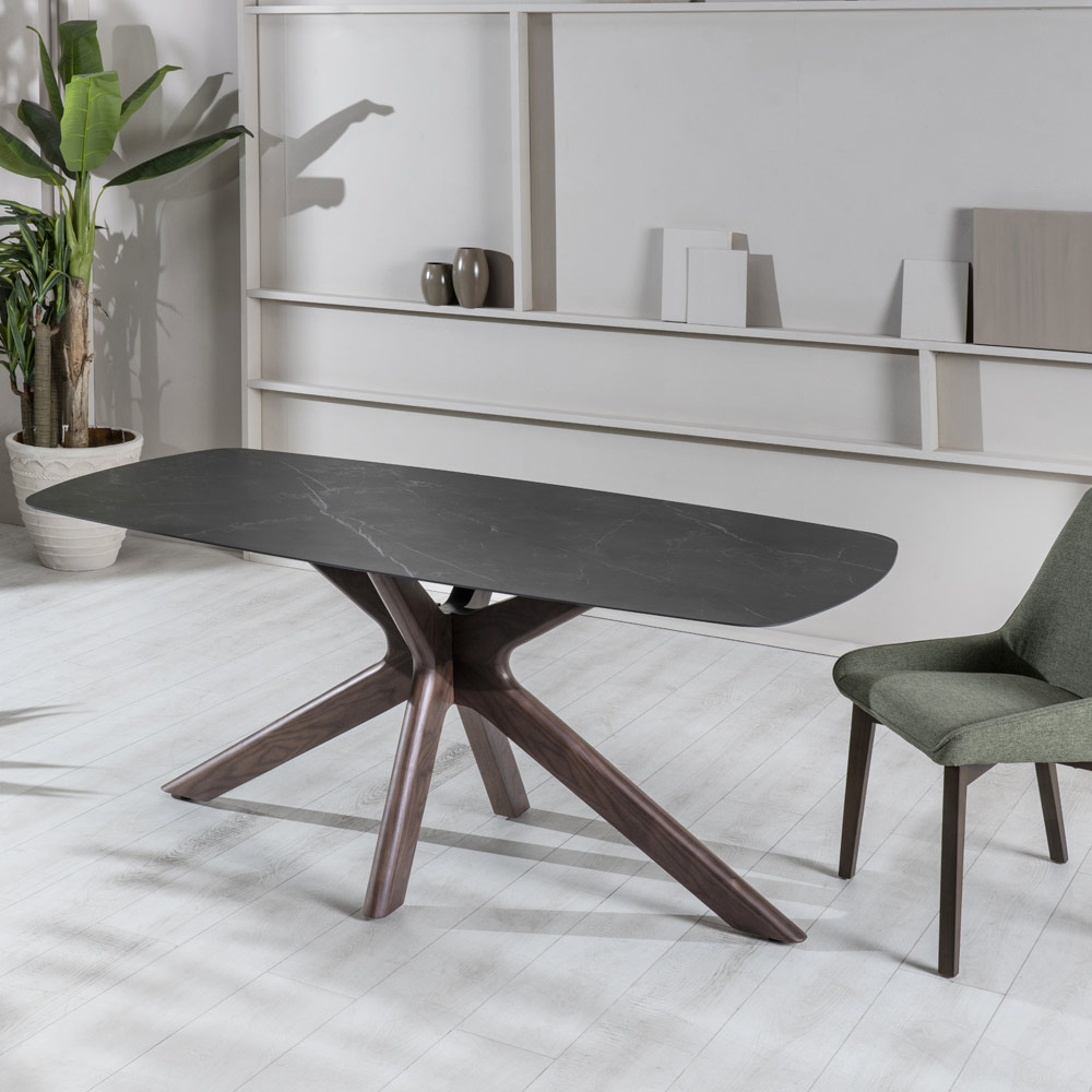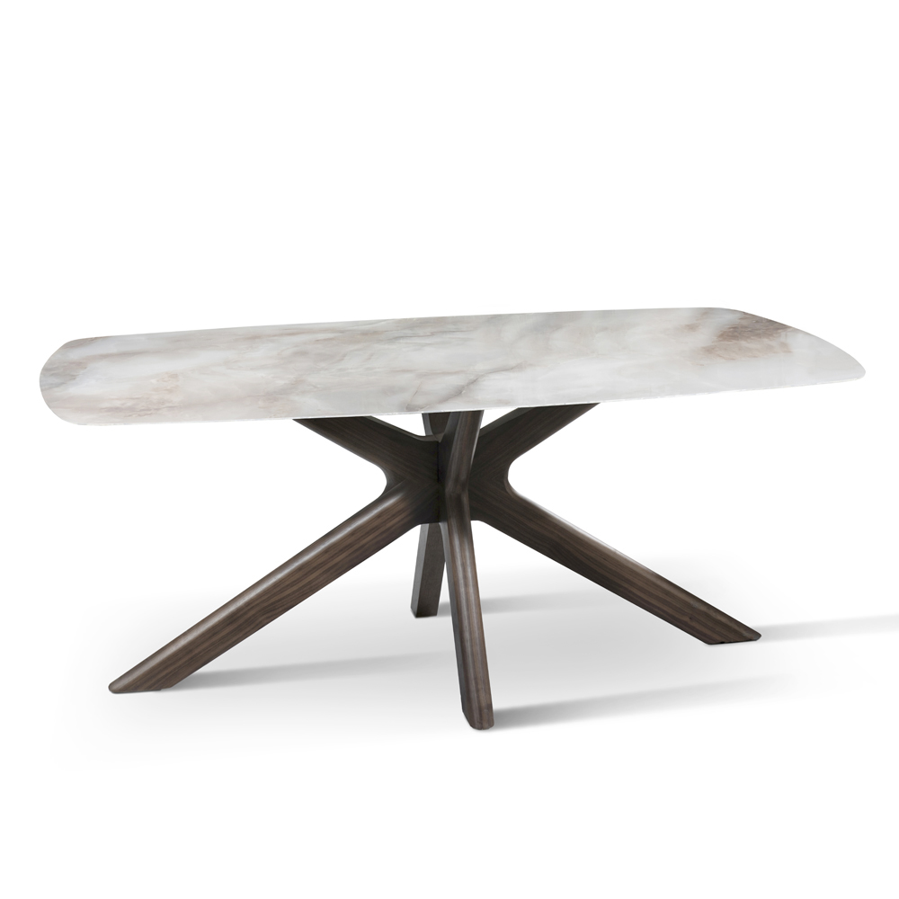 É uma mesa requintada e original, em que linhas fluidas e suaves brincam entre si, criando detalhes de grande força visual. O tampo em cerâmica repousa delicadamente sobre a base em forma de estrela, feita de nogueira maciça. Resultado de pesquisas que exploram os mais diversos estilos e inspirações, é um verdadeiro protagonista da área de estar, enquadrando-se harmoniosamente tanto em ambientes com design moderno quanto em espaços que privilegiam o luxo e o estilo clássico.