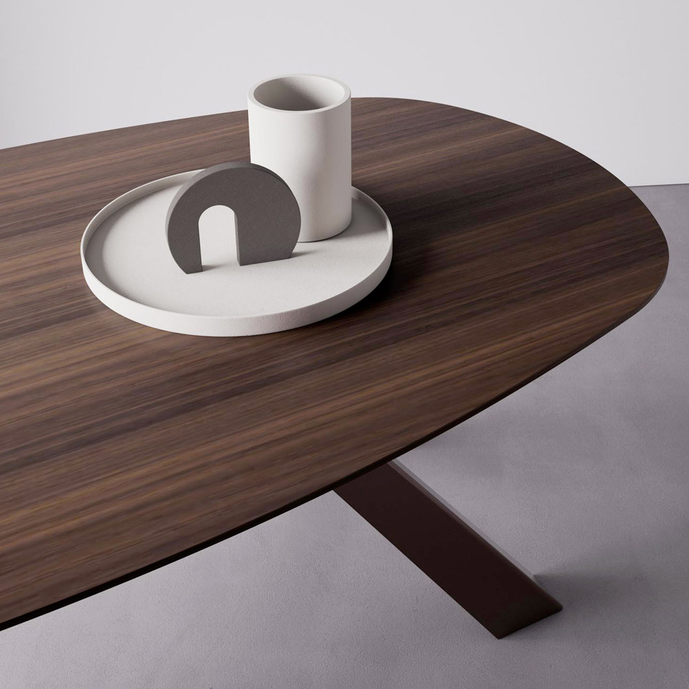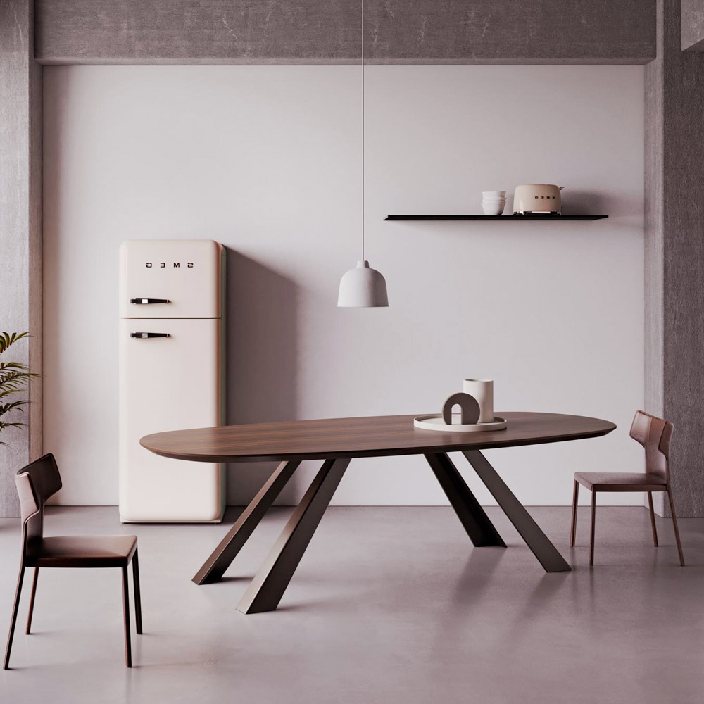 Mesa fixa com tampo elíptico e borda chanfrada Fabricado na Itália.