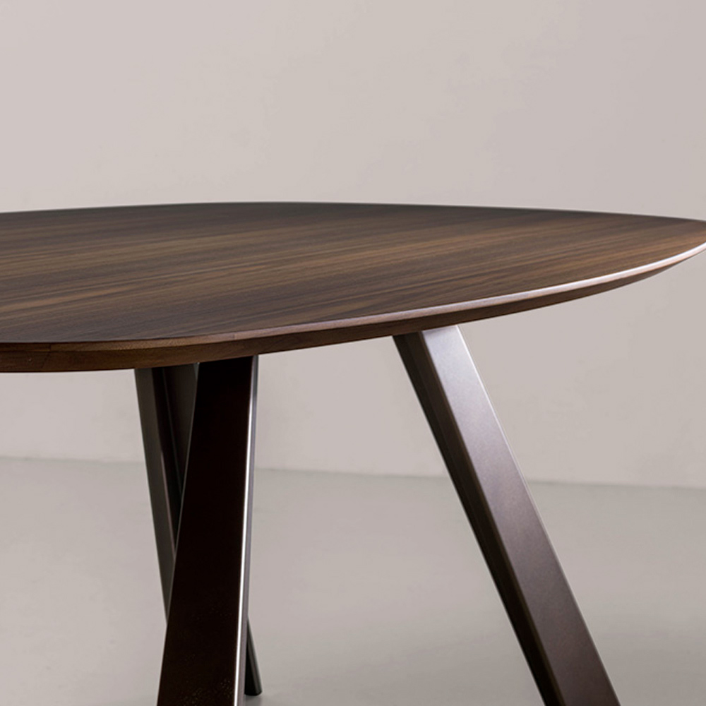 Mesa fixa com tampo elíptico biselado em bloco folheado a eucalipto e pés em metal pintado com acabamento bronze . Borda superior chanfrada Dimensões H 77 cm, espessura 3 cm.