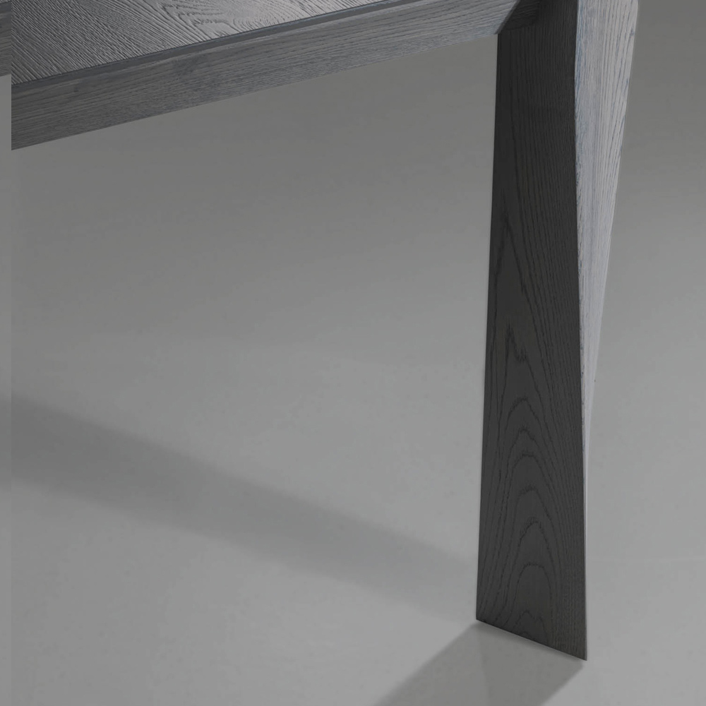Tabela fixa com tampo em bloco chanfrado em folheado de carvalho cinza e pernas lamelares helicoidais . Dimensões H 77 cm, espessura 2 cm.