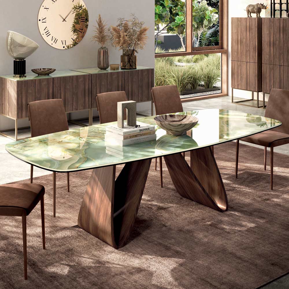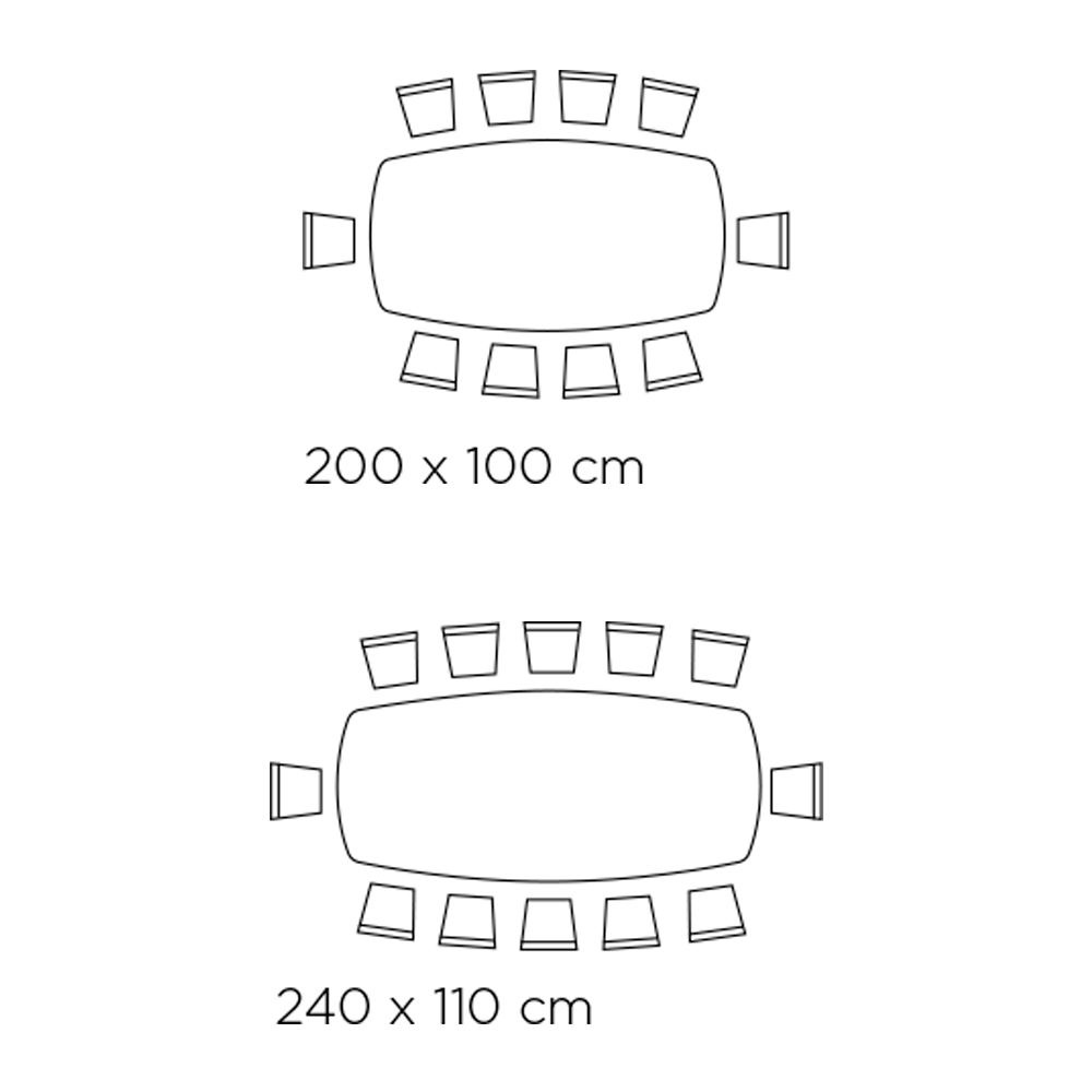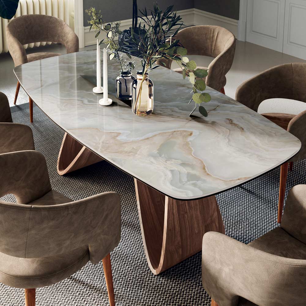 Graças à forma da base e aos acabamentos superiores disponíveis, a mesa é capaz de dar um