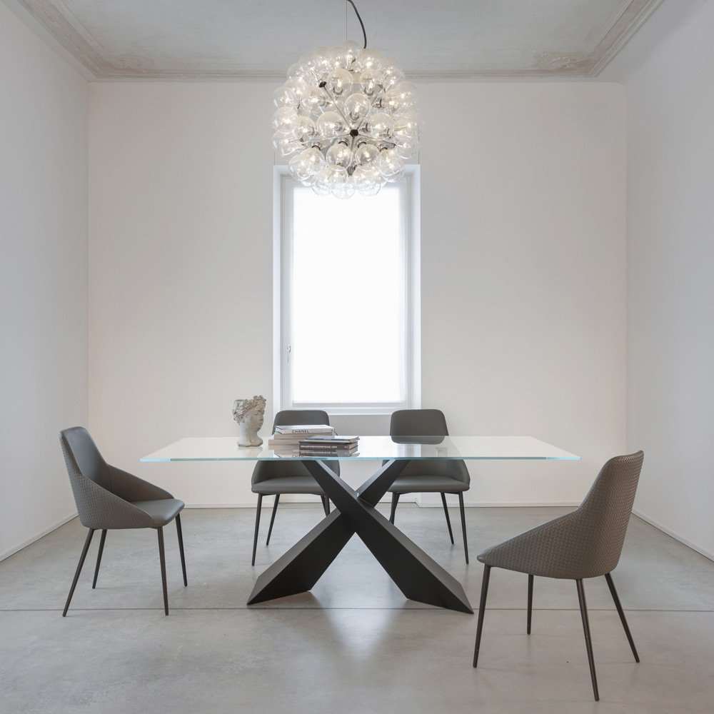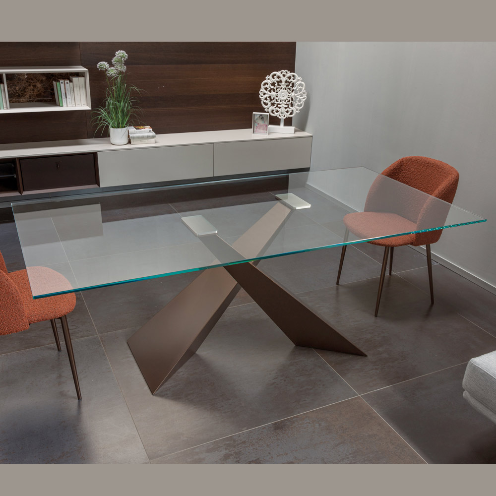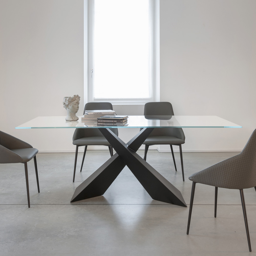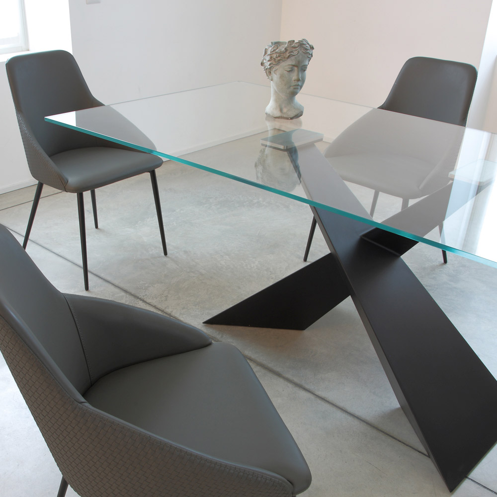 O protagonista absoluto é a base cruzada em metal pintado , com um design geométrico e dinâmico. As linhas marcantes criam um efeito escultural e arquitetônico , transformando a mesa em um verdadeiro elemento de decoração.