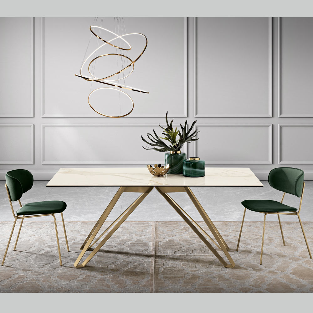 Impressionante pelo contraste de materiais e cores, esta mesa é uma verdadeira expressão de luxo e design moderno. O tampo em vitrocerâmica com efeito mármore calacatta e tons delicados é uma celebração da elegância natural, resistente e ao mesmo tempo extremamente requintado.