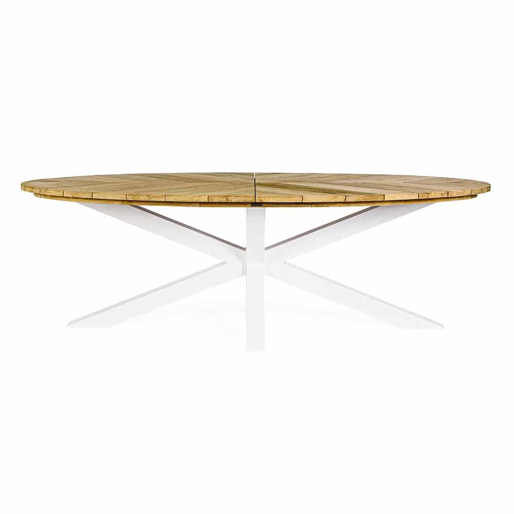 Tampo em madeira teca (classe A) - SVLK (madeira certificada de florestas sustentáveis), pés em alumínio com pintura eletrostática (poliéster). Ferramente em aço galvanizado.