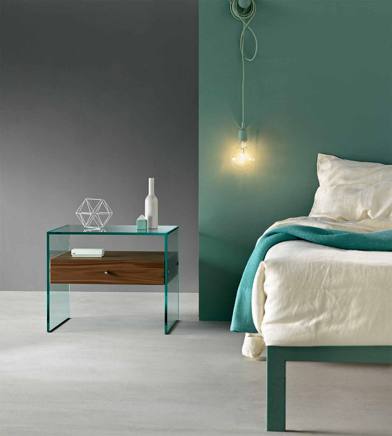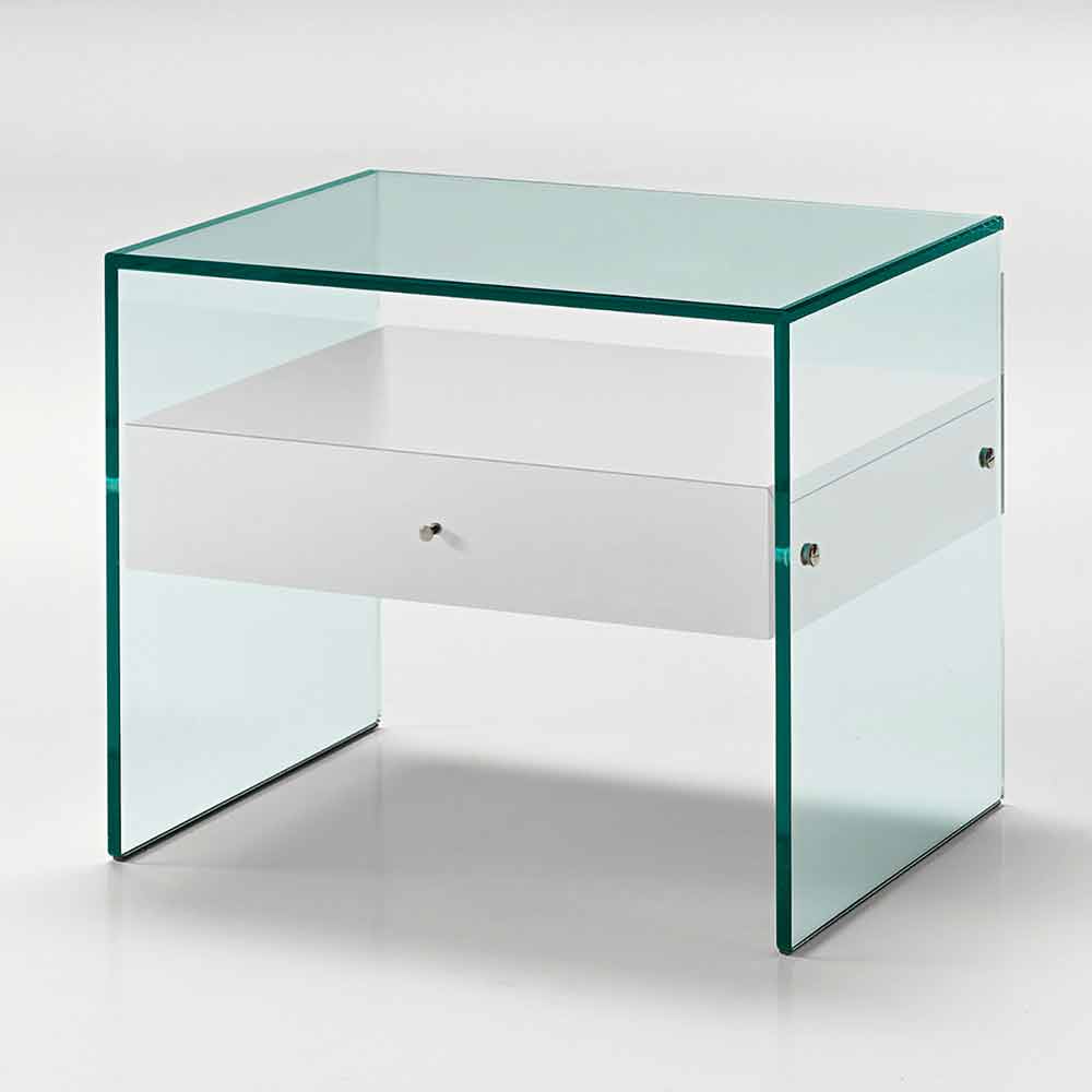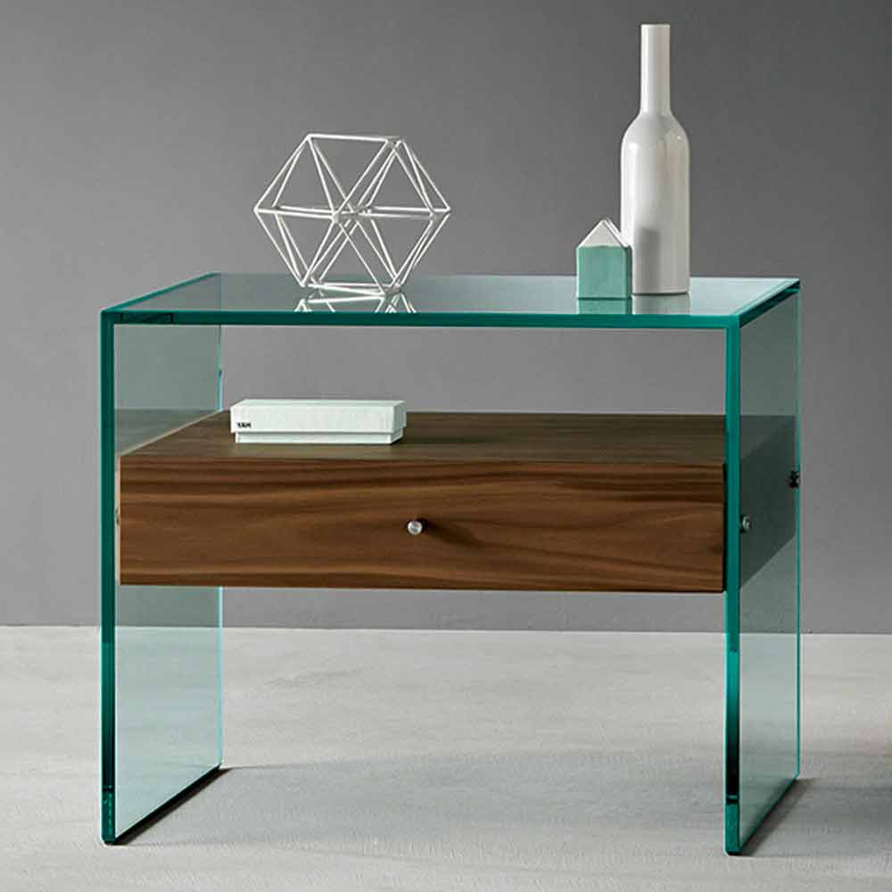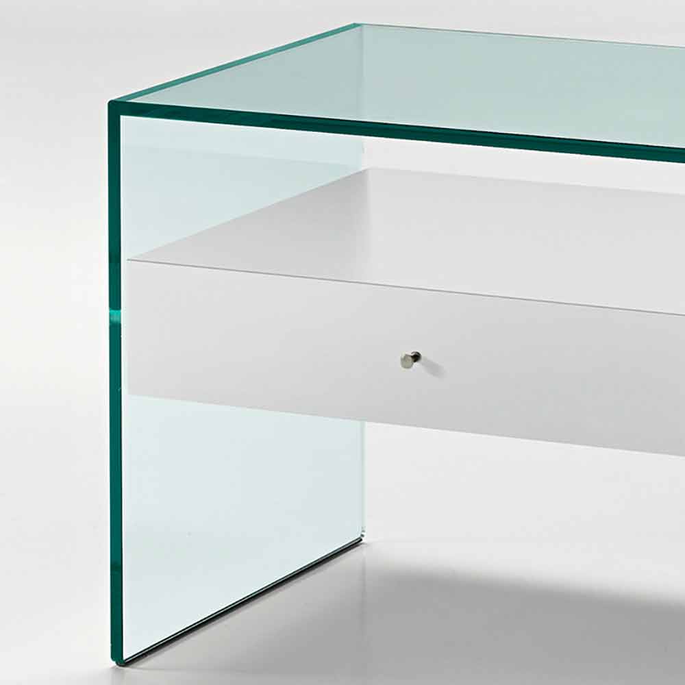 Mesa lateral de design moderno em vidro extraclear com gaveta de madeira, realizada à mão na Itália.