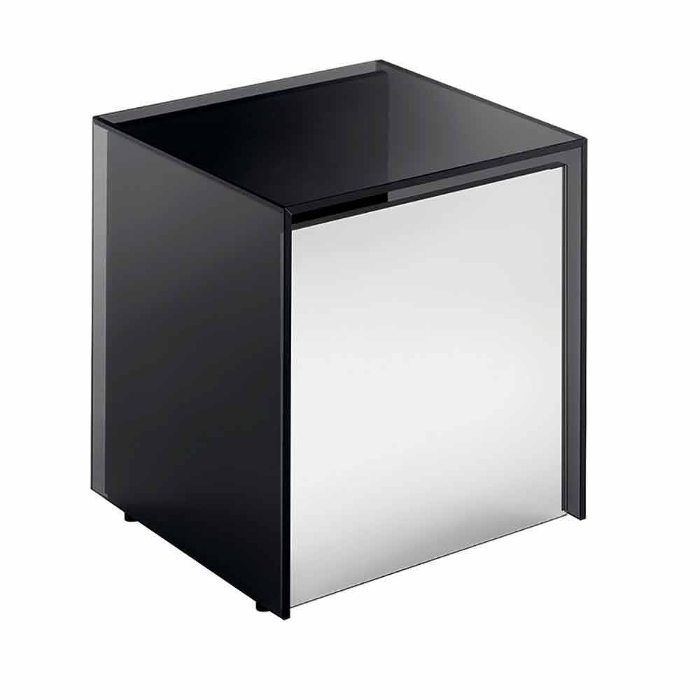 A peculiaridade é dada pelo vidro fumê com que é feito, utilizado para a estrutura externa, enquanto o efeito "vejo não vejo" da gaveta interna em madeira preta criam uma construção requintada e elegante.