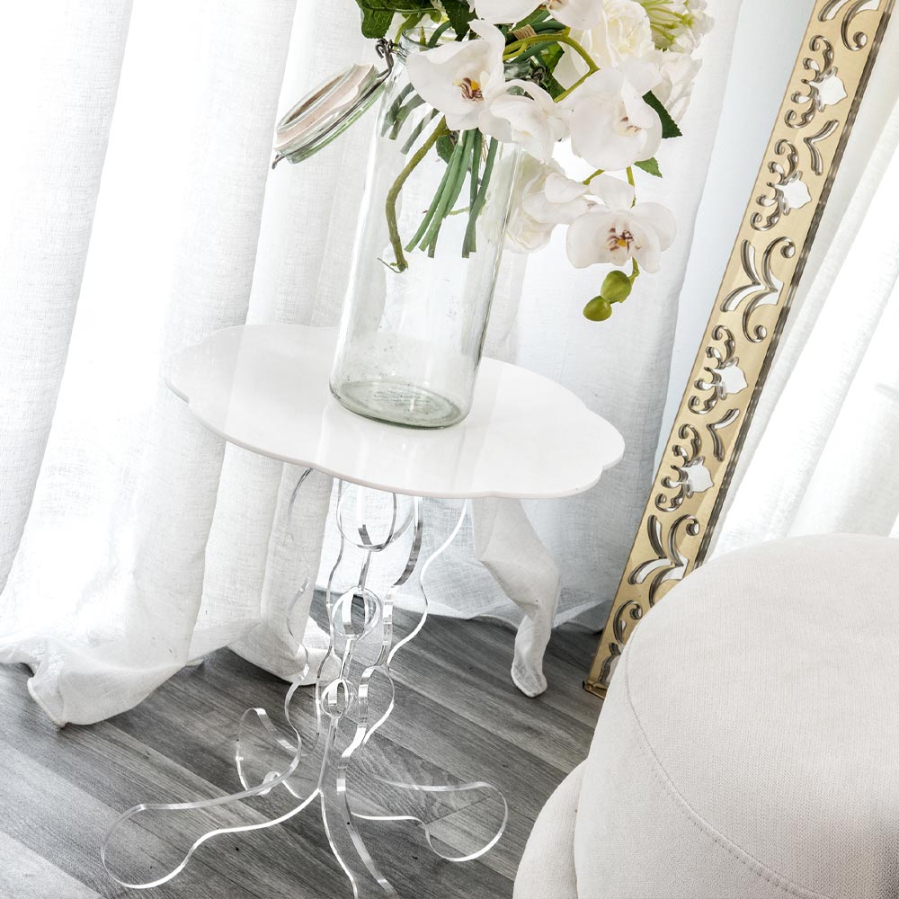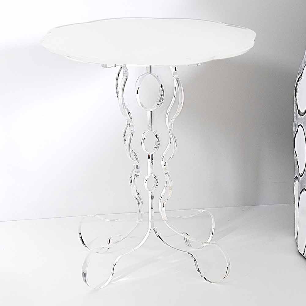 Um projeto mourisco caracteriza a mesa Janis, que pode ser usada tanto como uma mesa de café ou como uma mesa de cabeceira. A base da mesa é feita de plexiglass 100% PMMA em forma de laser. O tampo da mesa dá um toque de cor ao ambiente.