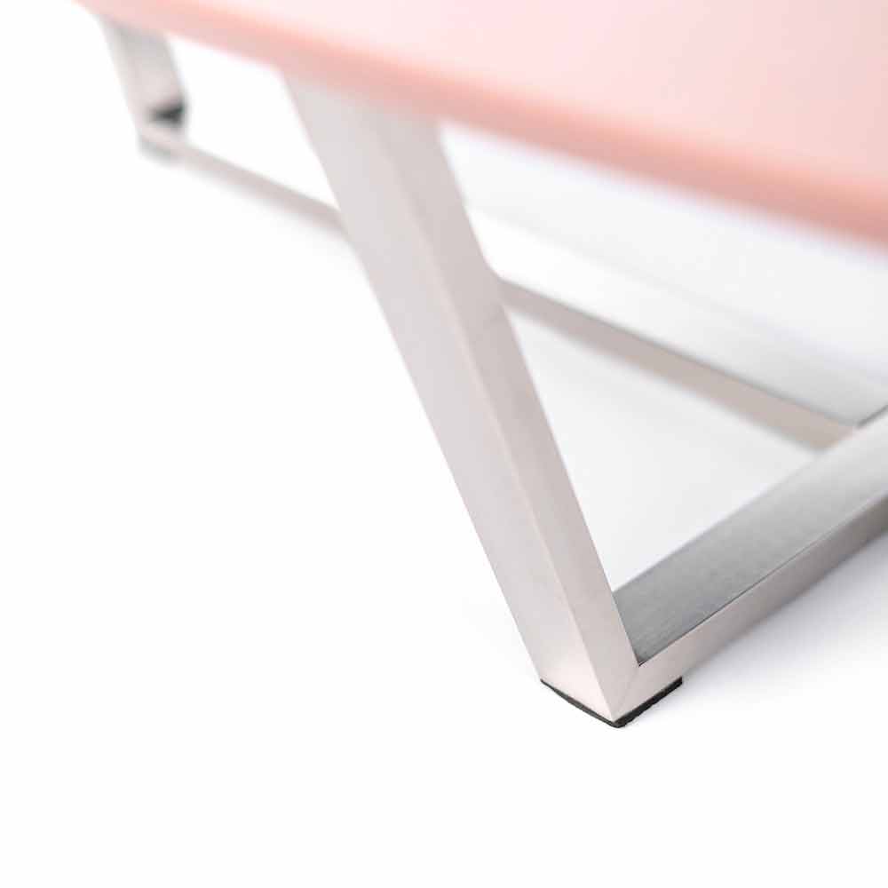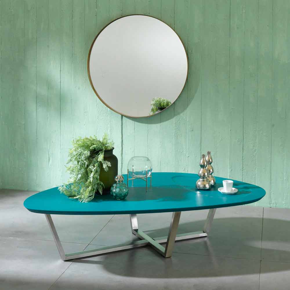Mesa de centro em formato de design moderno com tampo em MDF e base em metal cromado.