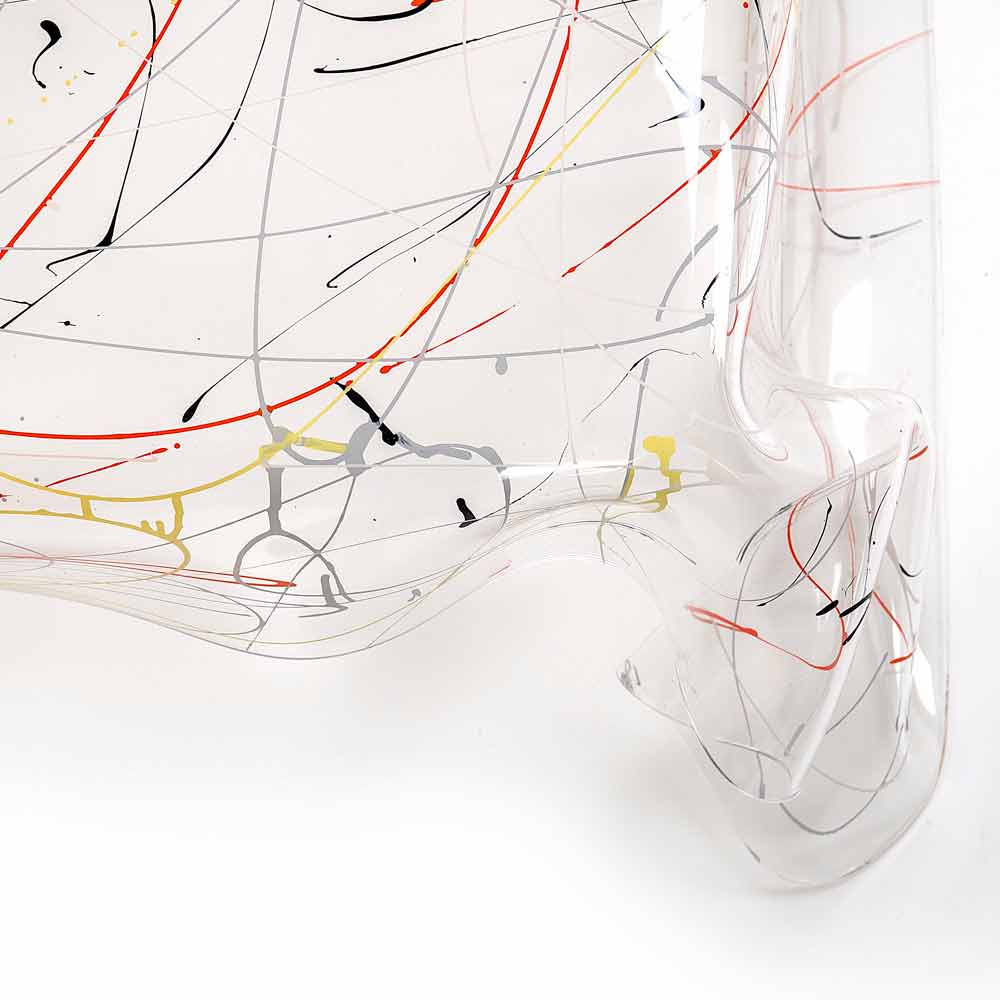 Uma folha de polímero virgem puro 100% de plexiglass de PMMA com tinta spray; É colocado à mão a altas temperaturas, para criar uma mesa única e irrepetível. A estrutura construída é completamente auto-sustentável.