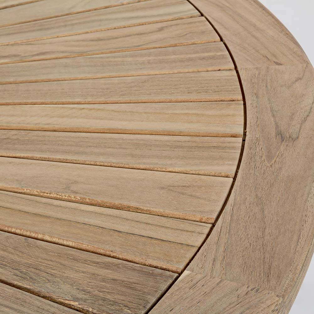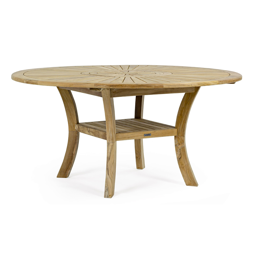 Mesa de jantar exterior de qualidade em madeira teca com tampo central giratório.