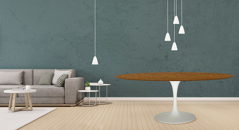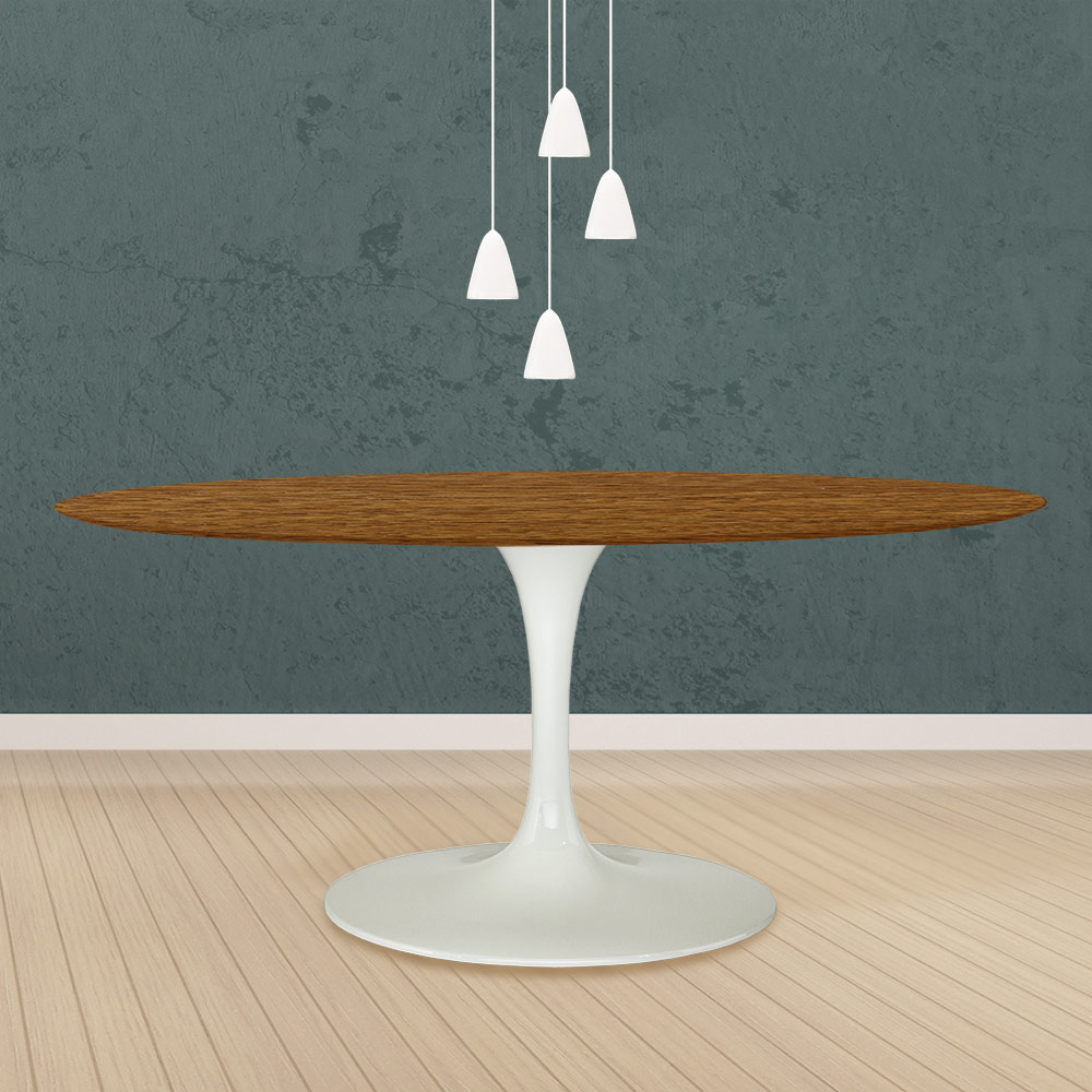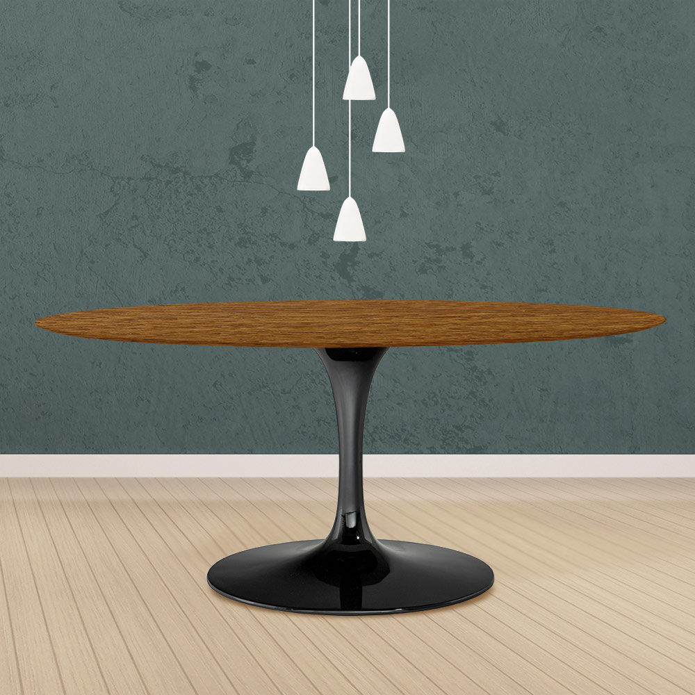 forma oval e o tampo de carvalho manchado de nogueira clara dá a esta mesa um