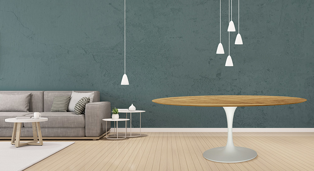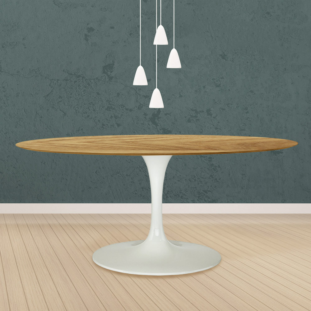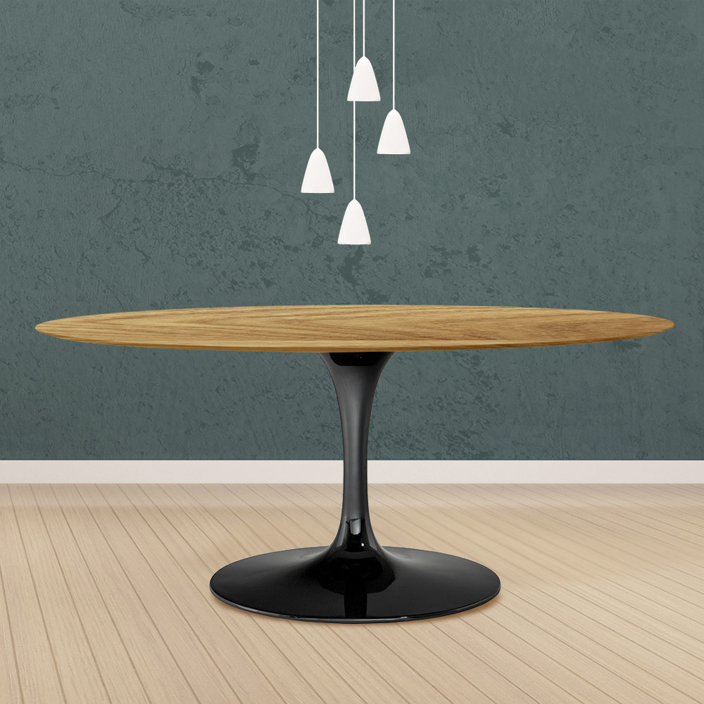 forma oval e o tampo de carvalho natural dá a esta mesa um