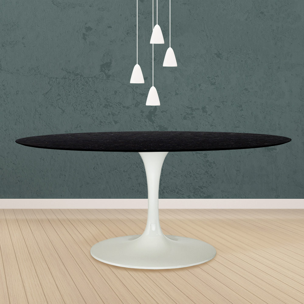 forma oval e o tampo de carvalho manchado de preto dá a esta mesa um