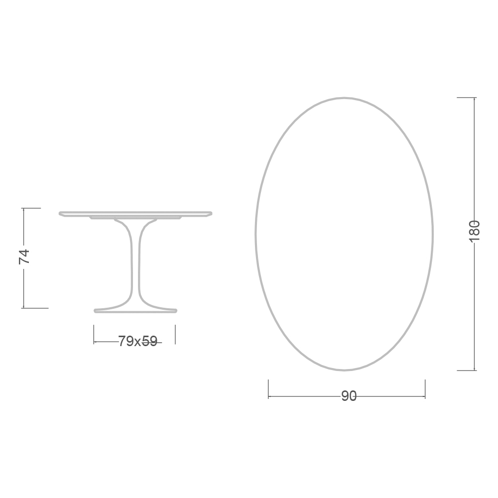 - Tampo da mesa: 180 x 90 / Base oval: 79 x 59 cm x A 73 cm