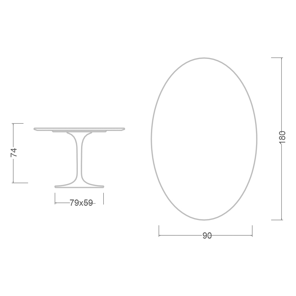 - Tampo da mesa: 179 x 111 / Base oval: 79 x 59 cm x A 73 cm