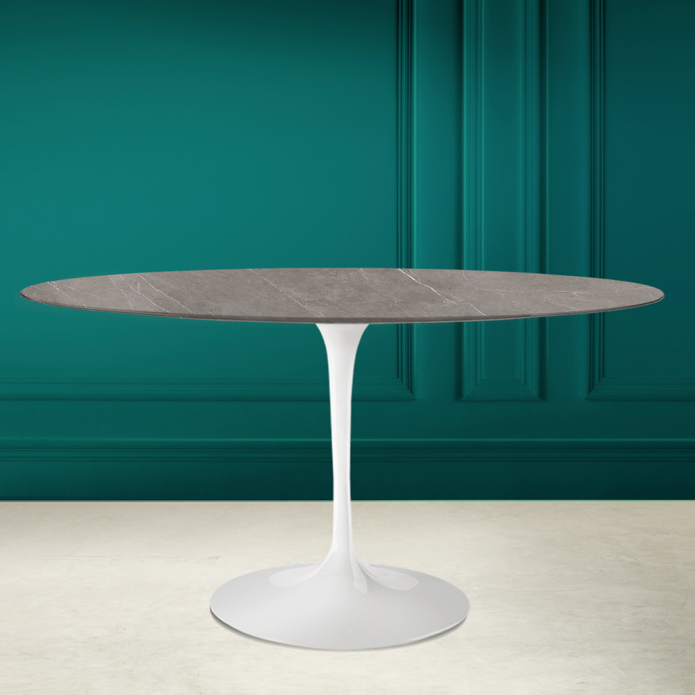 Made in Italy. Esta mesa tem duas caraterísticas que a tornam única no seu género: a forma oval e a cerâmica de pedra cinzenta. A