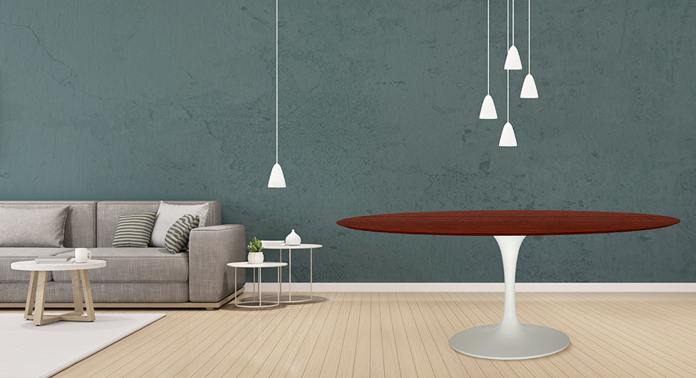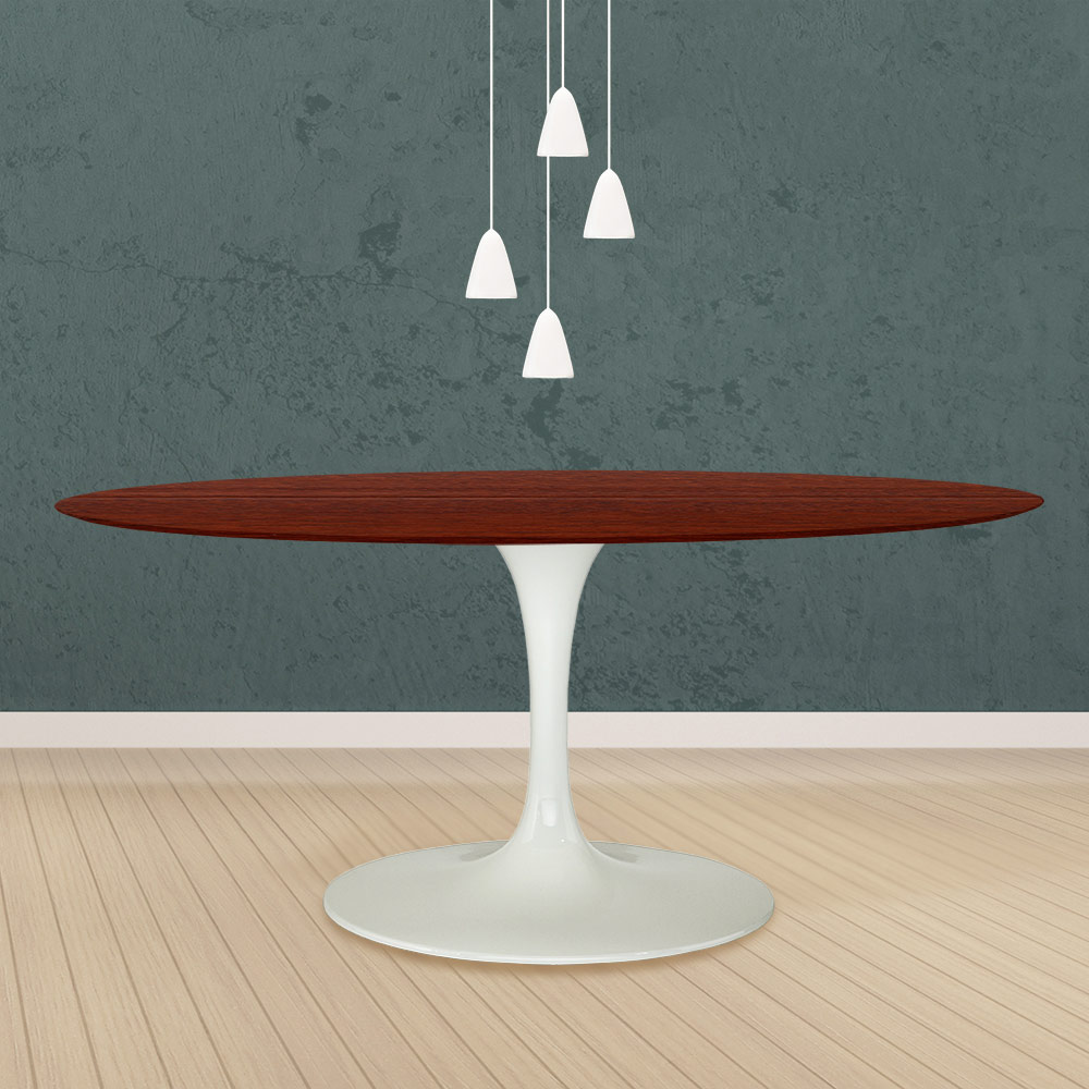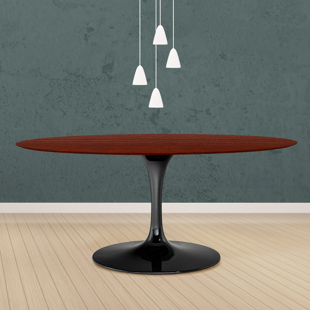 forma oval e o tampo de carvalho manchado de pau-rosa dá a esta mesa um