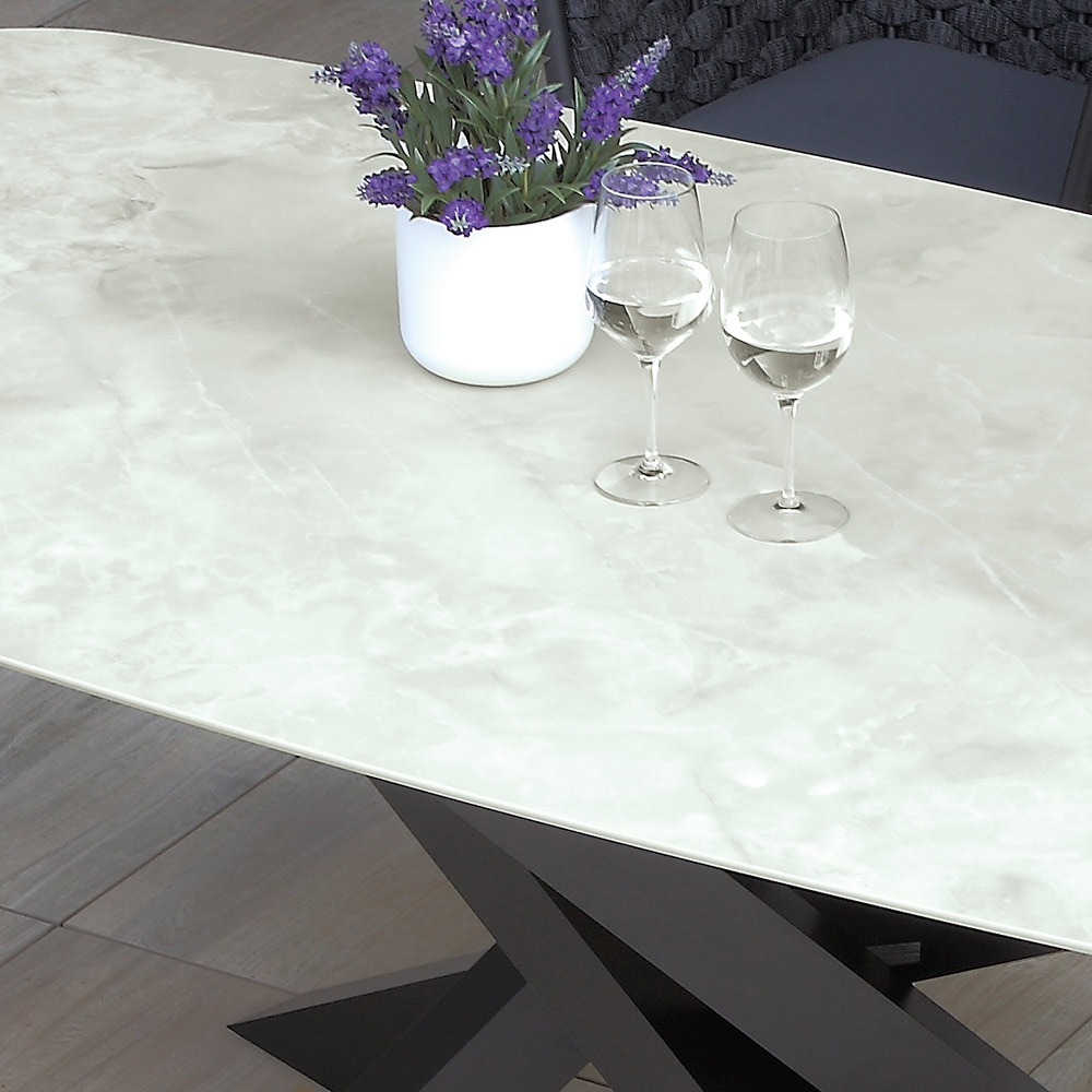 O tampo adiciona um toque de brilho sofisticado e se destaca pela textura delicada e bordas arredondadas, que suavizam a geometria da mesa, tornando-a perfeita tanto para ambientes privados quanto para corporativos. A base escultural em cruz, visualmente impressionante, oferece excelente estabilidade e uma dose extra de personalidade contemporânea .