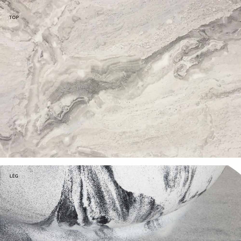 clássico para a sala de jantar , nasceu graças à colaboração com a produção interna e à pesquisa contínua sobre o processamento do material. Assim nascem diferentes composições, que se inspiram nos acabamentos de mármore mais procurados. A meio caminho entre o artesanato e a indústria, o profundo conhecimento do departamento de produção no processamento de materiais plásticos permite criar um acabamento único em cada peça, com todas as imperfeições que tornam o trabalho de um artesão maravilhoso.