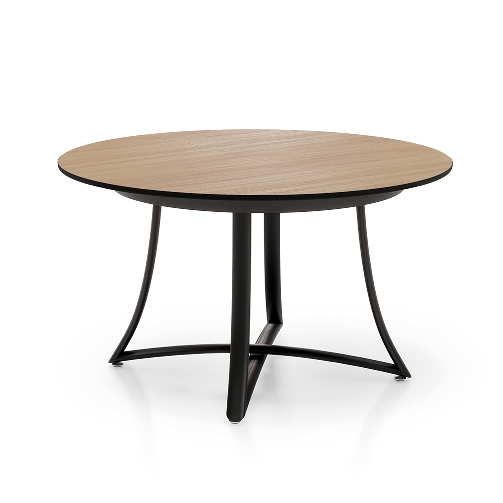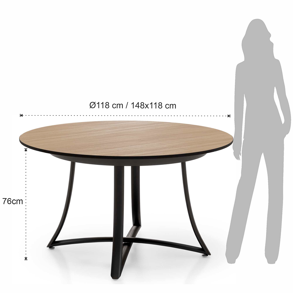 Esta mesa extensível redonda é um exemplo perfeito de design moderno que combina funcionalidade e estilo. Com tampo em madeira, esta mesa transmite um ambiente caloroso e acolhedor, enquanto a base em metal preto oferece um forte contraste visual que acrescenta um toque de elegância contemporânea ao conjunto.