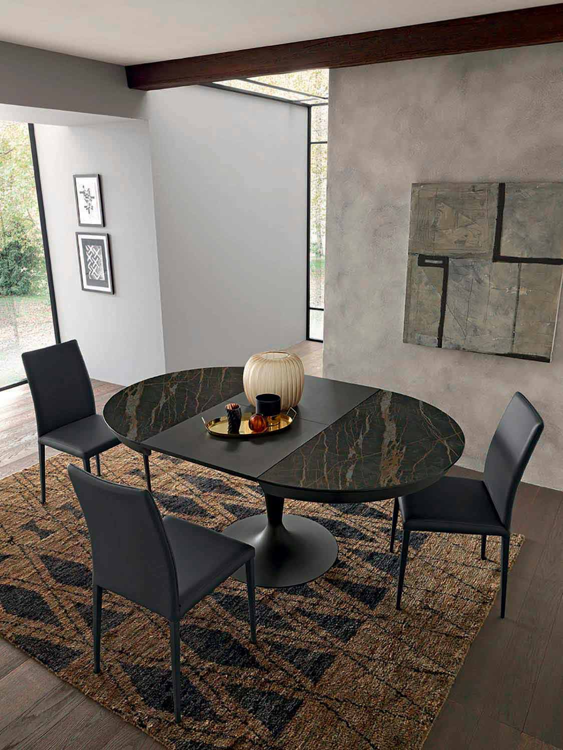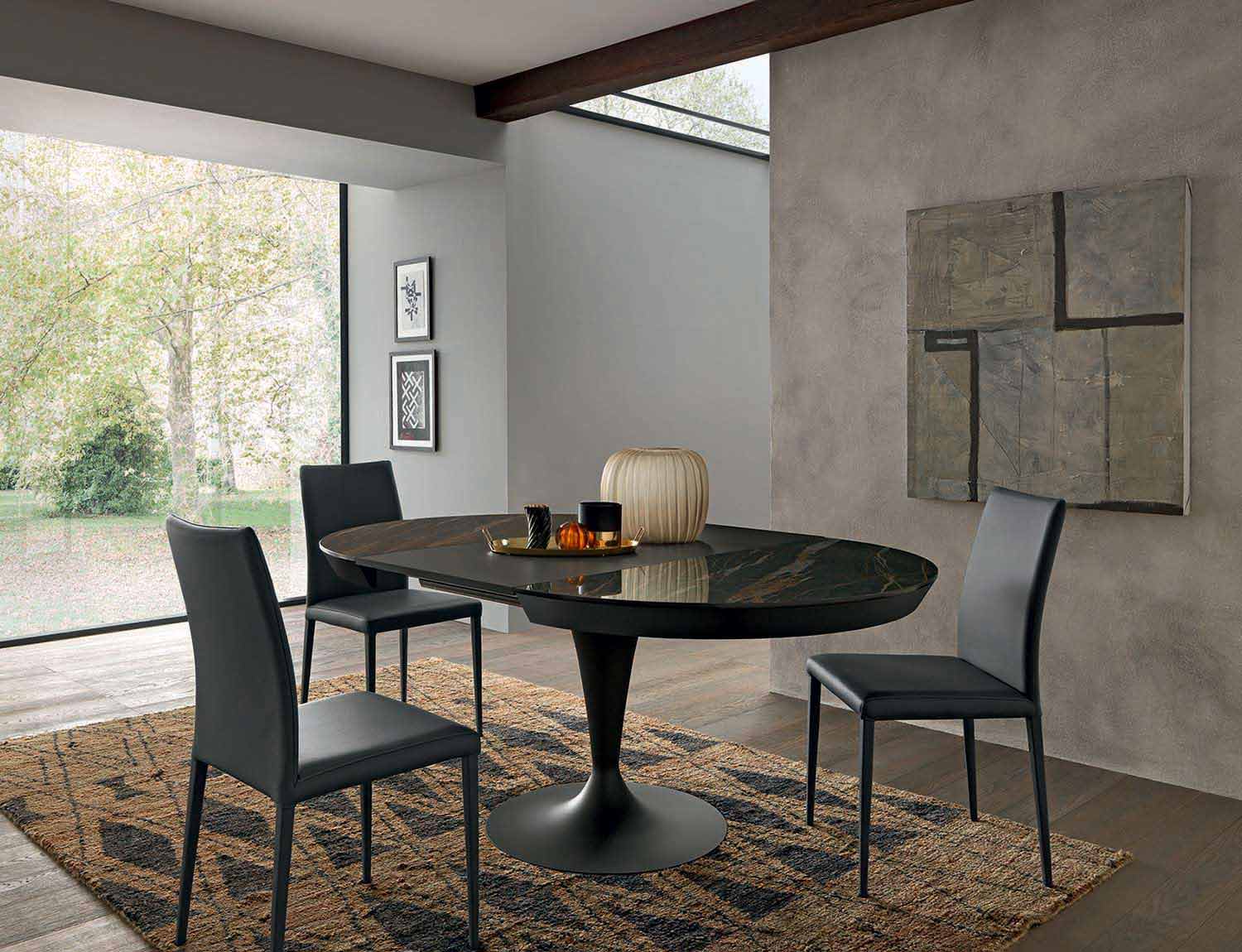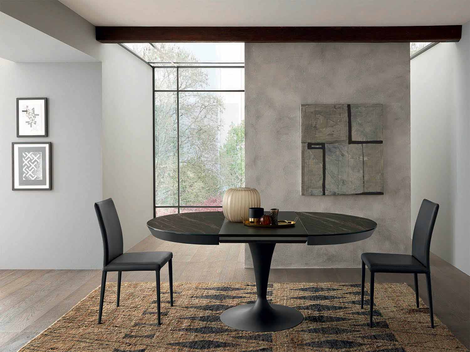 Mesa de jantar extensível de design com tampo redondo de cerâmica laminada e base de metal Made in Italy.