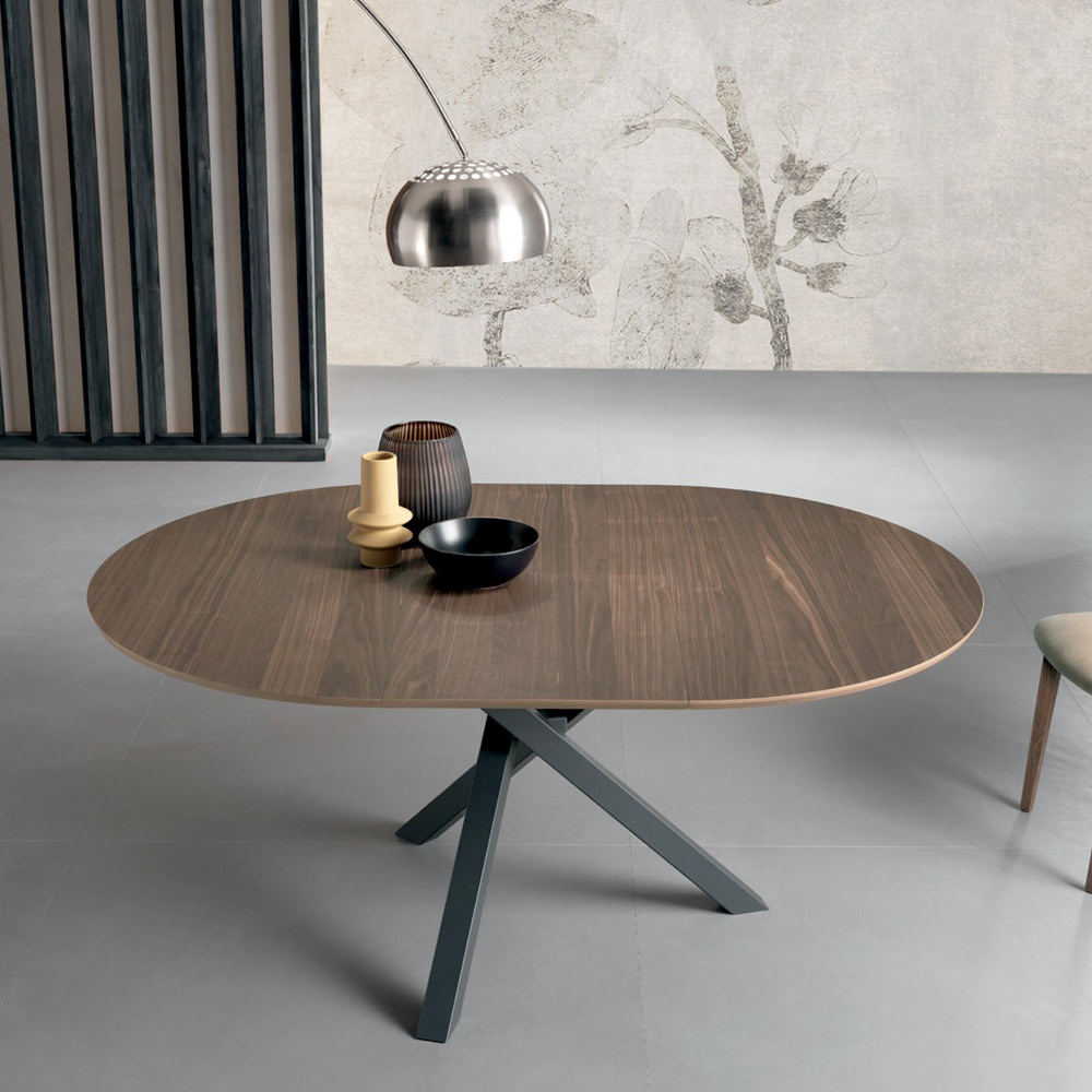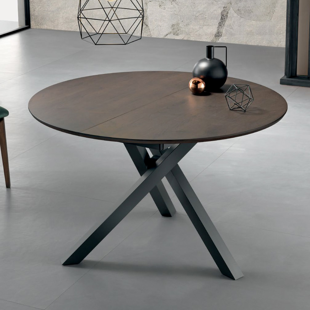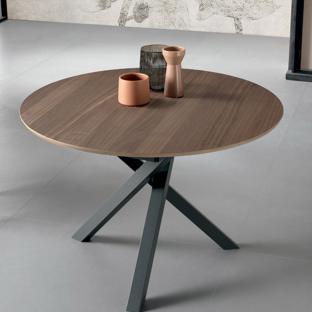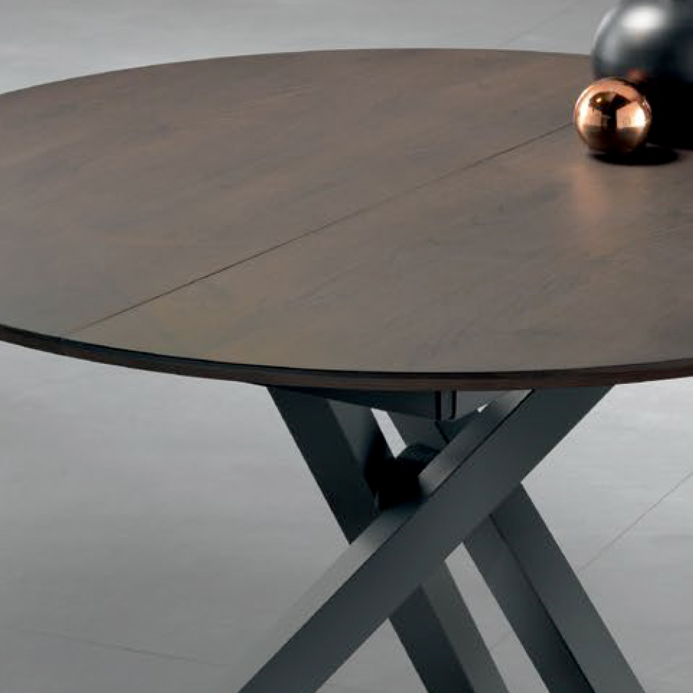 Mesa redonda, com 120 cm de diâmetro, extensível até 170 cm, com tampo em folheado de nogueira Canaletto de 20 mm de espessura e perfil inclinado.