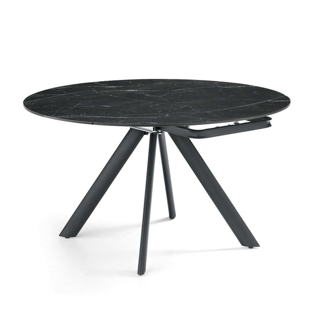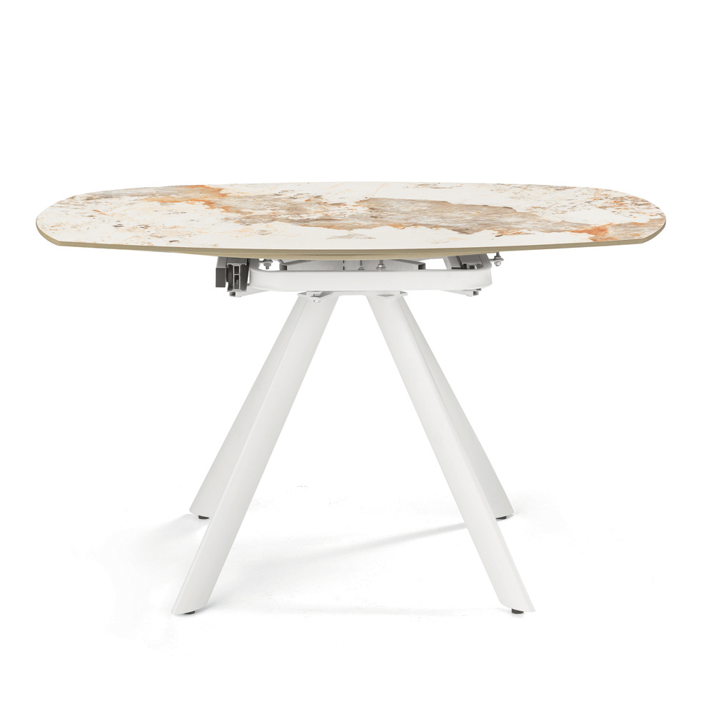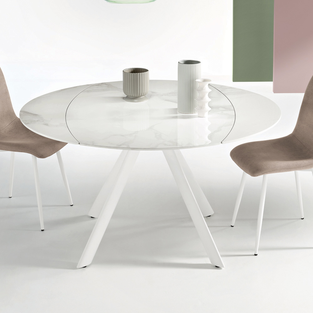 Elegante mesa de jantar extensível, projetada para mobiliar com estilo sua sala de estar ou sala de jantar . O tampo em pedra sinterizada com efeito mármore oferece uma superfície durável, refinada e fácil de limpar, perfeita para o uso diário.